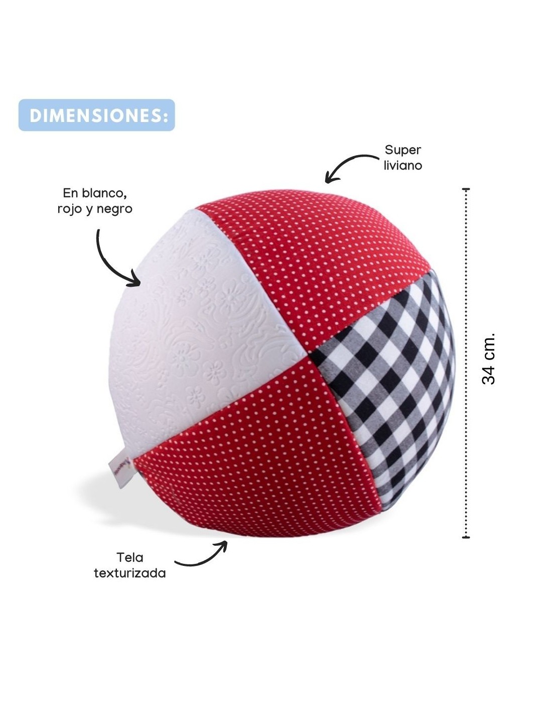 Balón sensorial elaborado en tela con tonos en alto contraste (blanco, rojo, negro) para captar la atención del bebé y lograr un estímulo visual y sensorial. Los bebés al nacer poseen una capacidad visual limitada que se irá desarrollando rápidamente gracias a la estimulación del entorno, sin embargo durante sus primeras semanas los bebés solo se interesan por colores contrastantes (blanco, negro y rojo) es por esto que este balón es eficaz para provocar respuestas visuales en comparación con otro tipo de estímulos.
