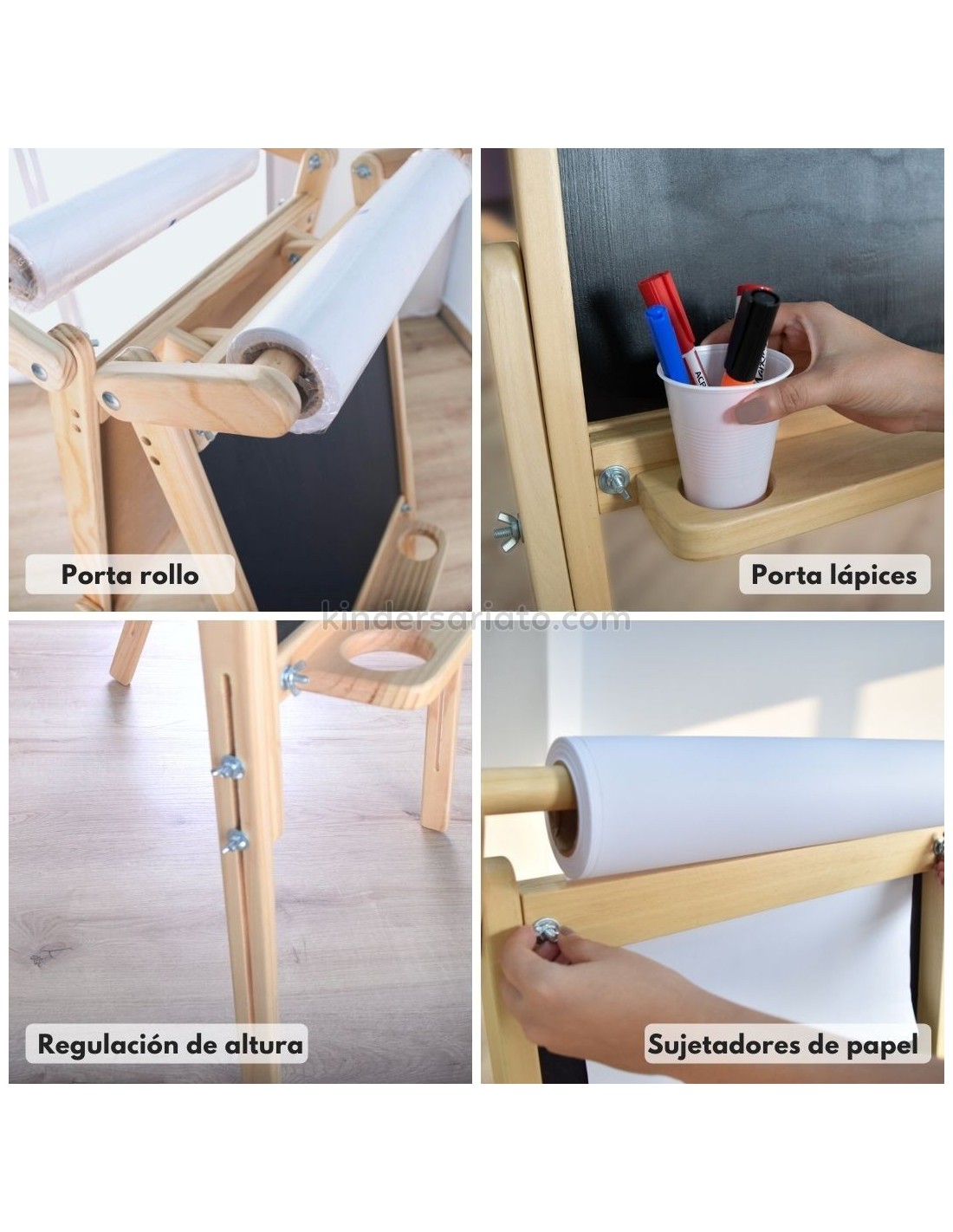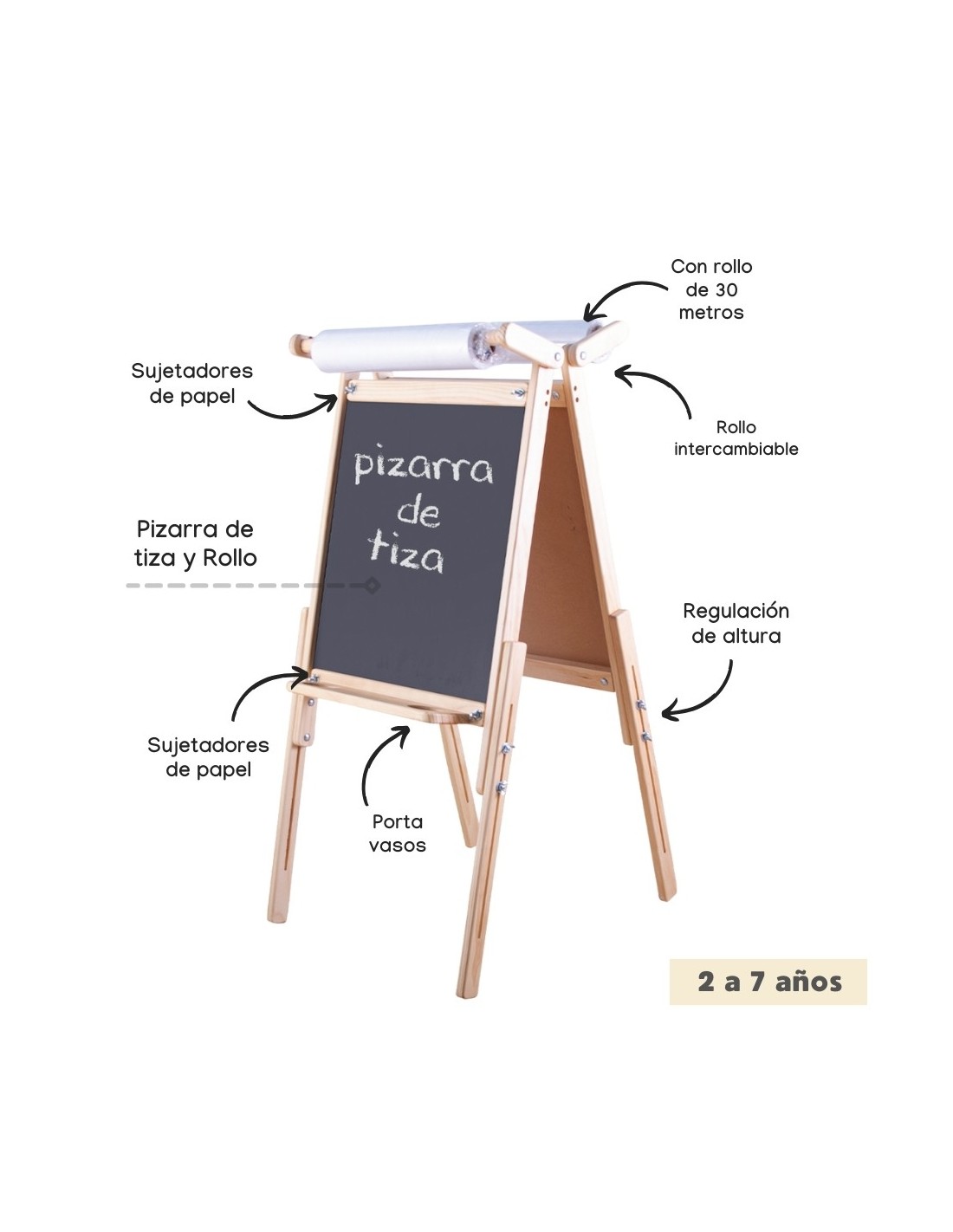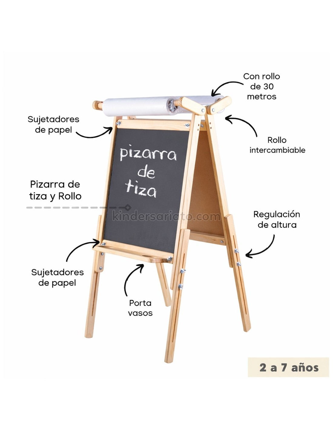 - Contiene pizarra de tiza y porta rollo para pintar.