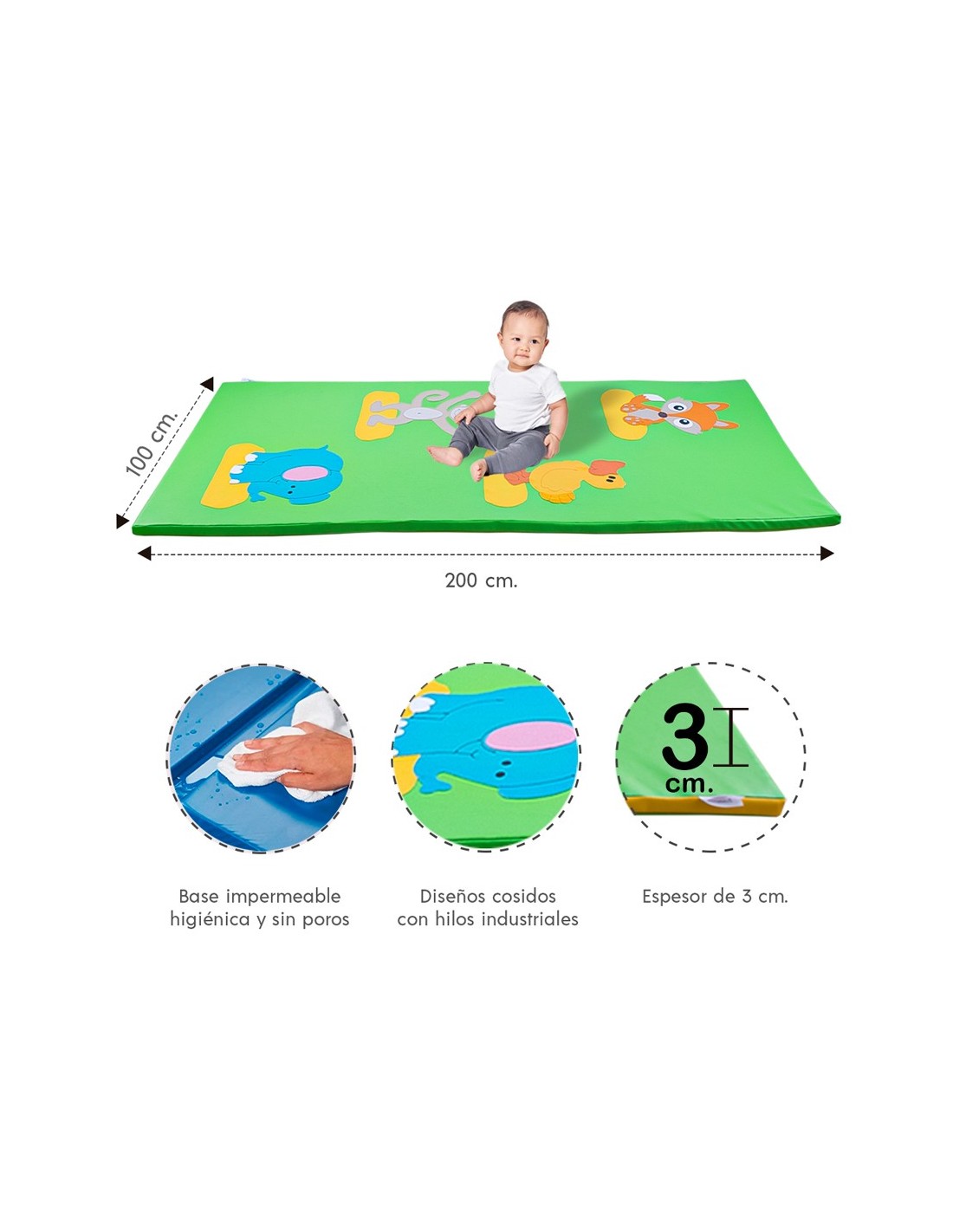 Nuestras colchonetas de gateo facilitan el desplazamiento del bebé ya que tienen la superficie y el espesor adecuado. Además son impermeables, no tienen poros como la tela o el fomix eva, no producen ácaros, no producen alergias. Son totalmente higiénicas y muy fáciles de limpiar.