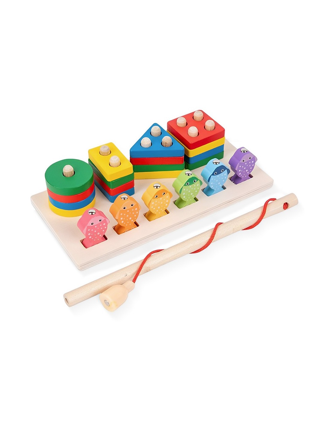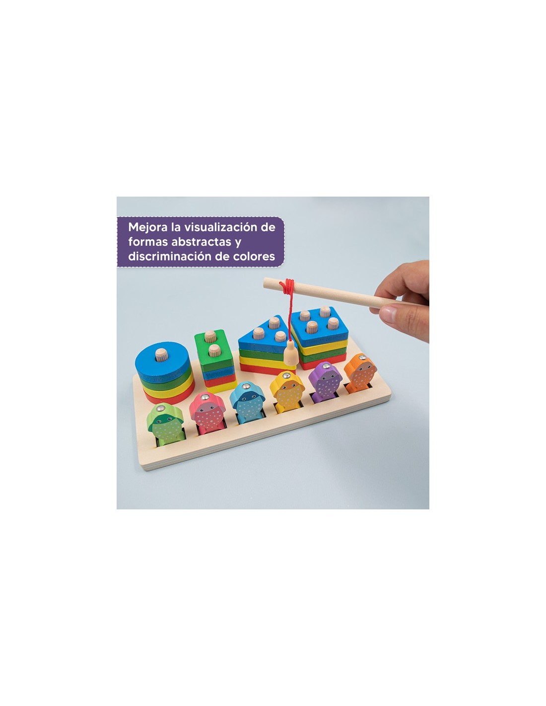 Juego para embonar en madera con 16 figuras geométricas y 6 peces de colores. Reconocimiento de colores, figuras geométricas, y cantidad. Estas piezas son de madera con diferentes colores. Los niños reconocen colores y también permite la comprensión preliminar de las figuras geométricas.