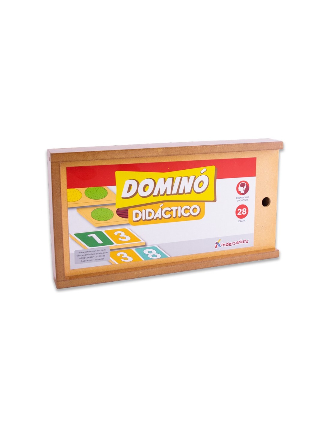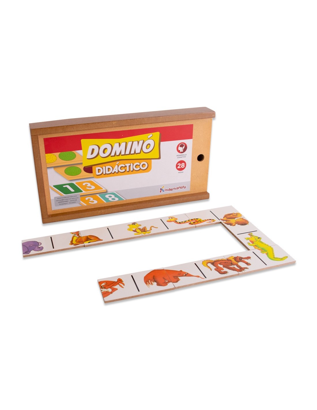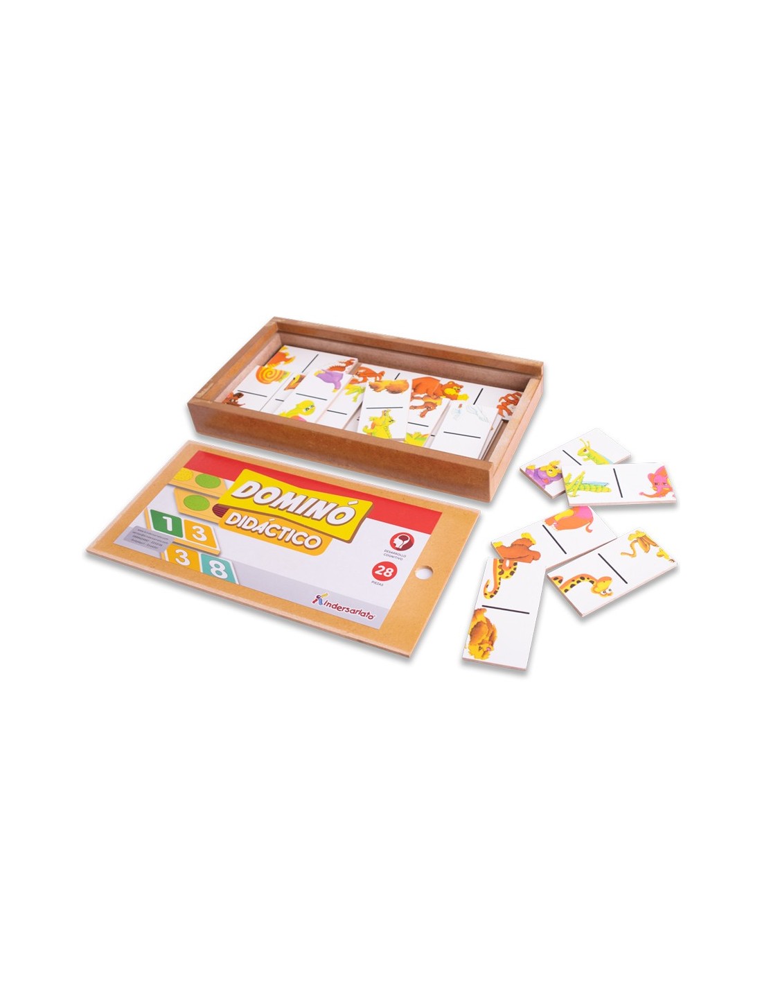 El juego en caja de madera contiene 28 fichas. Sus fichas están pintadas directamente sobre la madera con protección UV y colores brillantes. Incluye caja de madera para guardar las fichas.