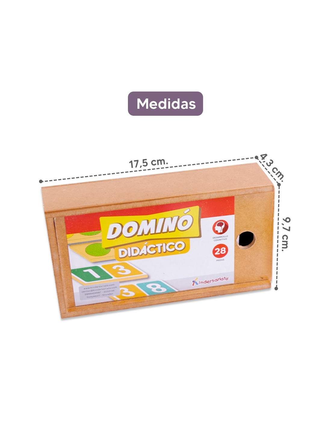 El juego en caja de madera contiene 28 fichas. Sus fichas están pintadas directamente sobre la madera con protección UV y colores brillantes. Incluye caja de madera.