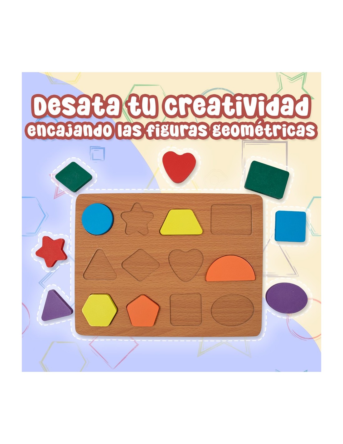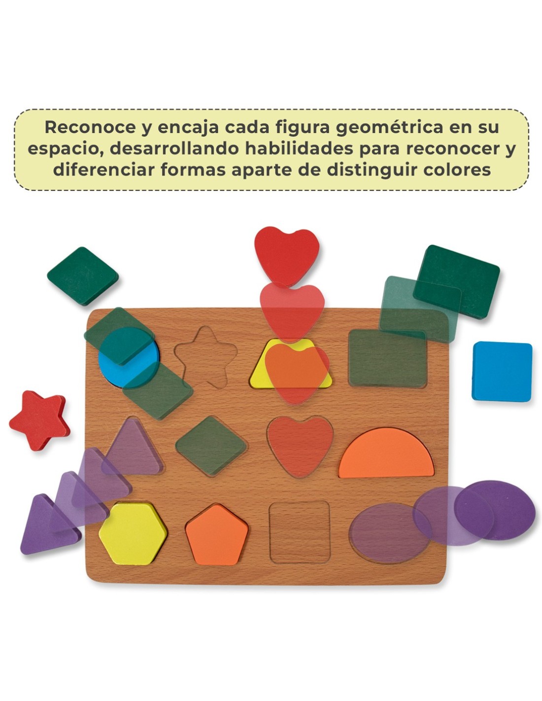 Este encajable presenta una variedad de figuras geométricas únicas, cada una en un color vibrante. Los niños pueden jugar y aprender mientras encajan las formas en sus espacios correspondientes, desarrollando el reconocimiento de formas y colores de manera interactiva.