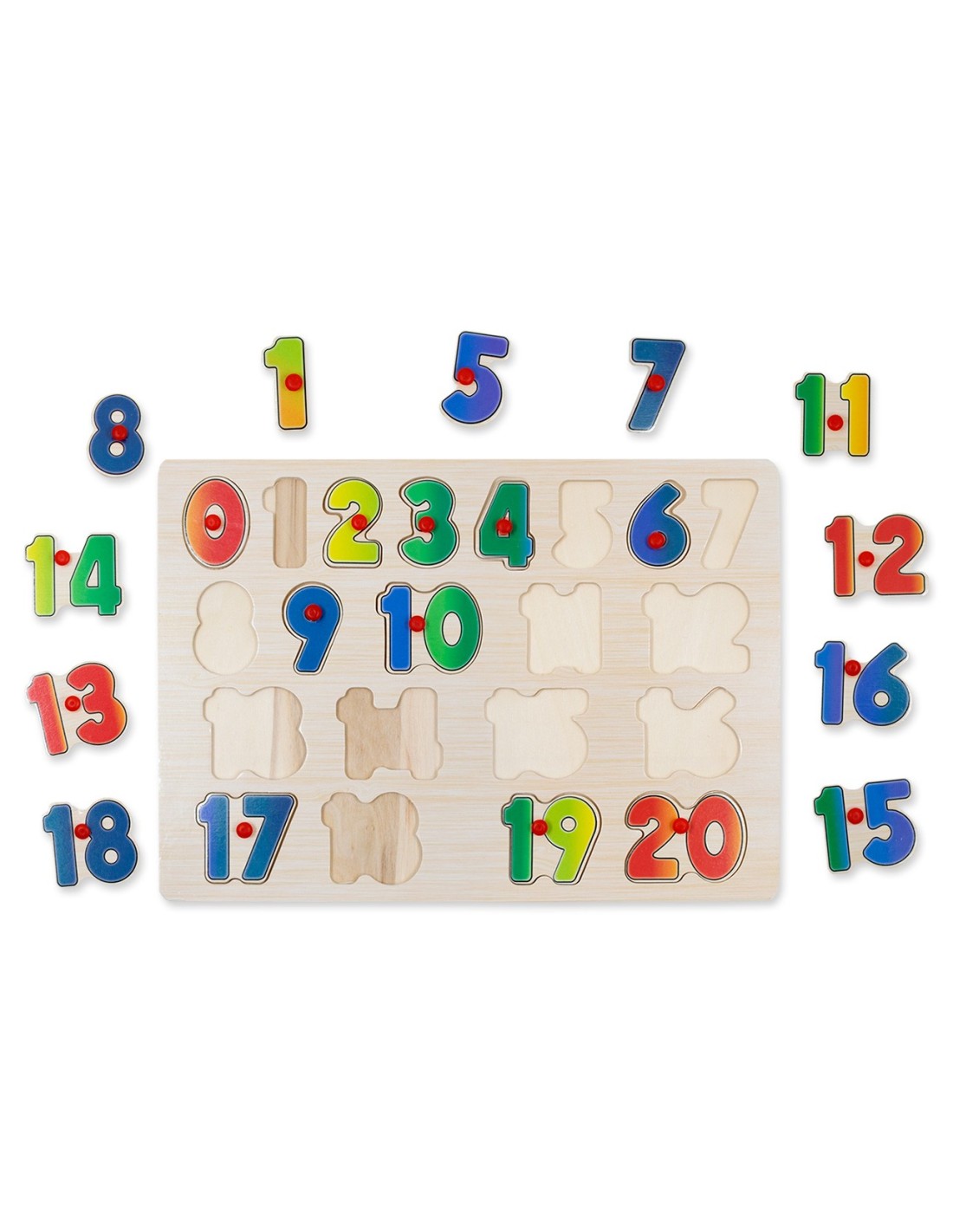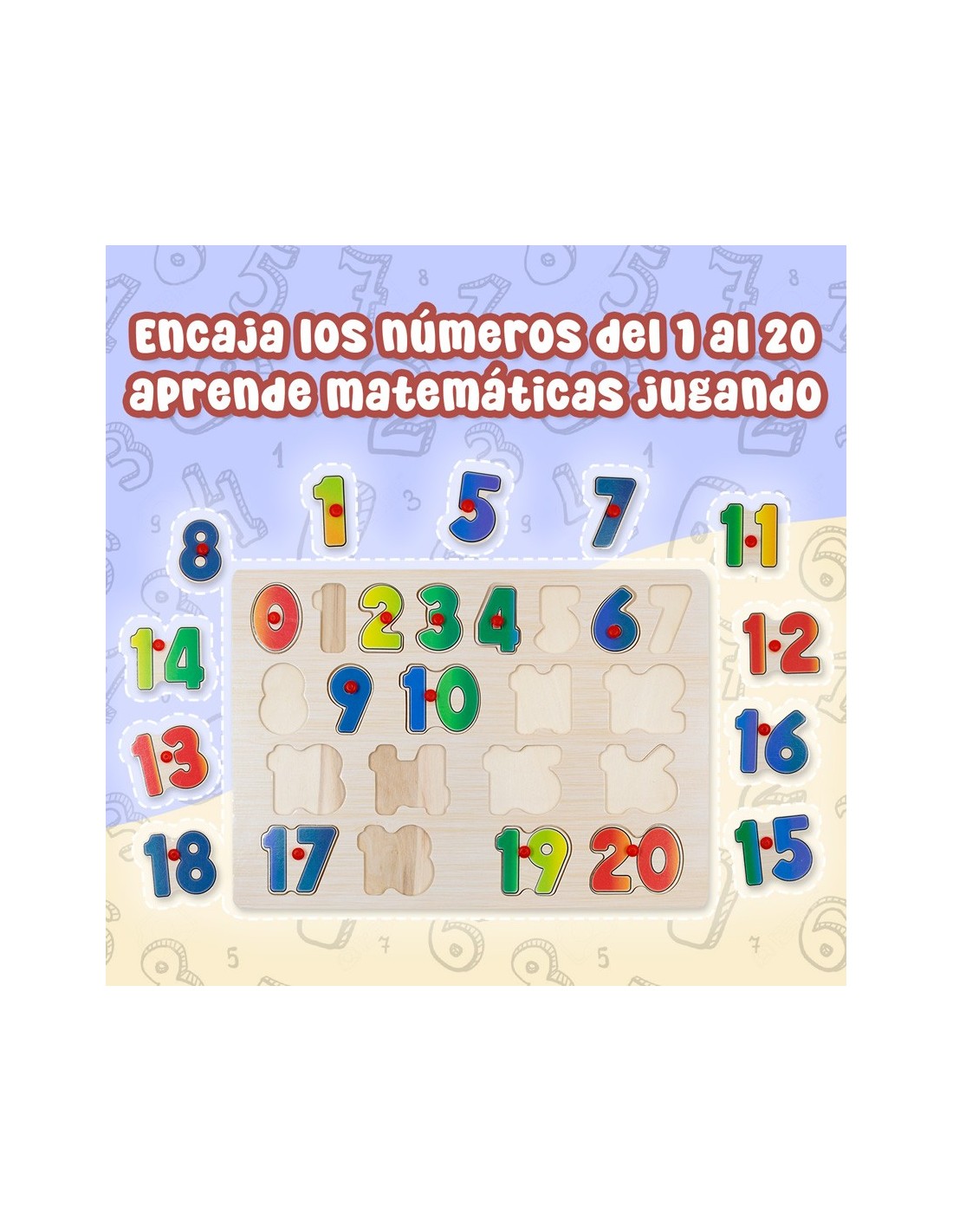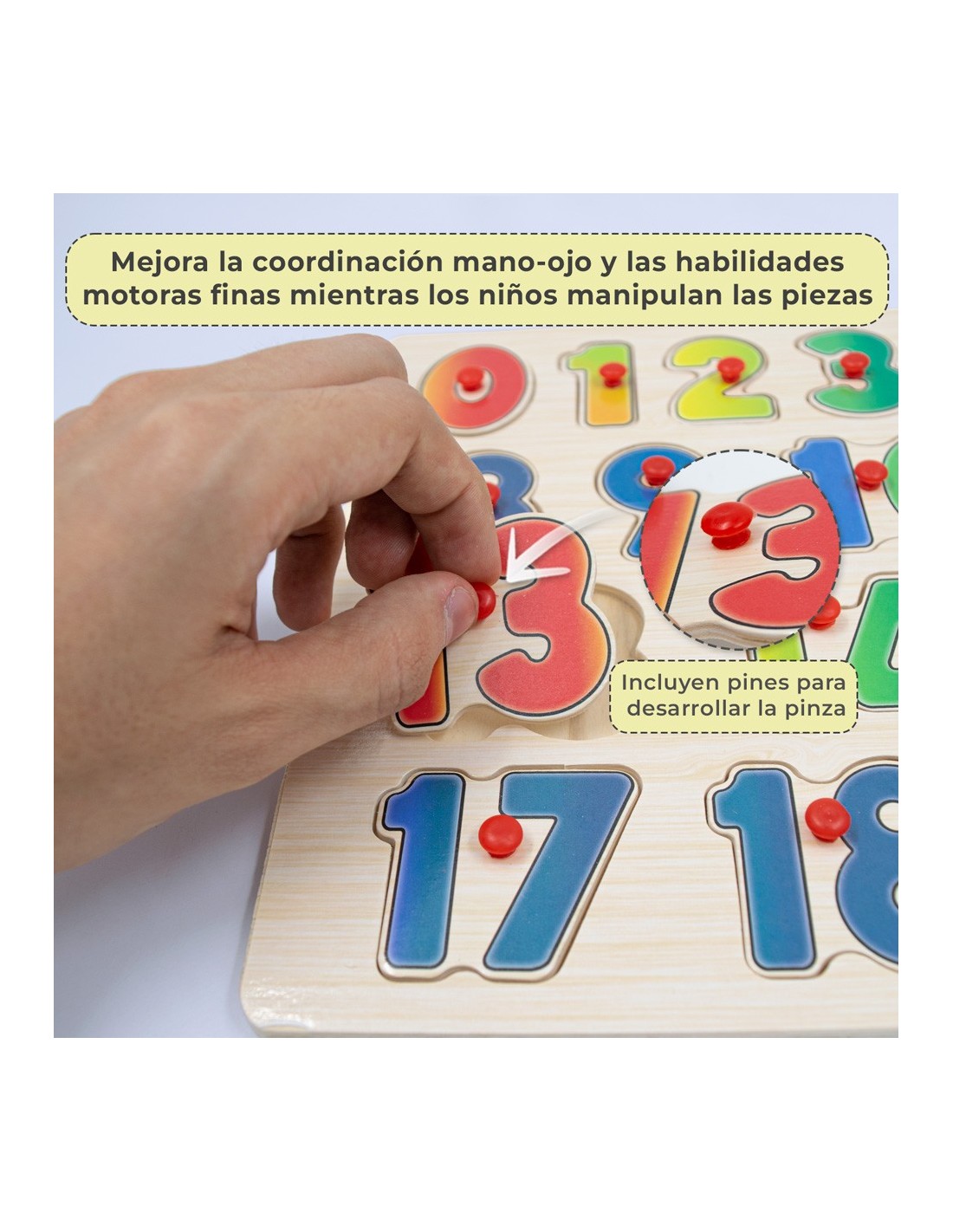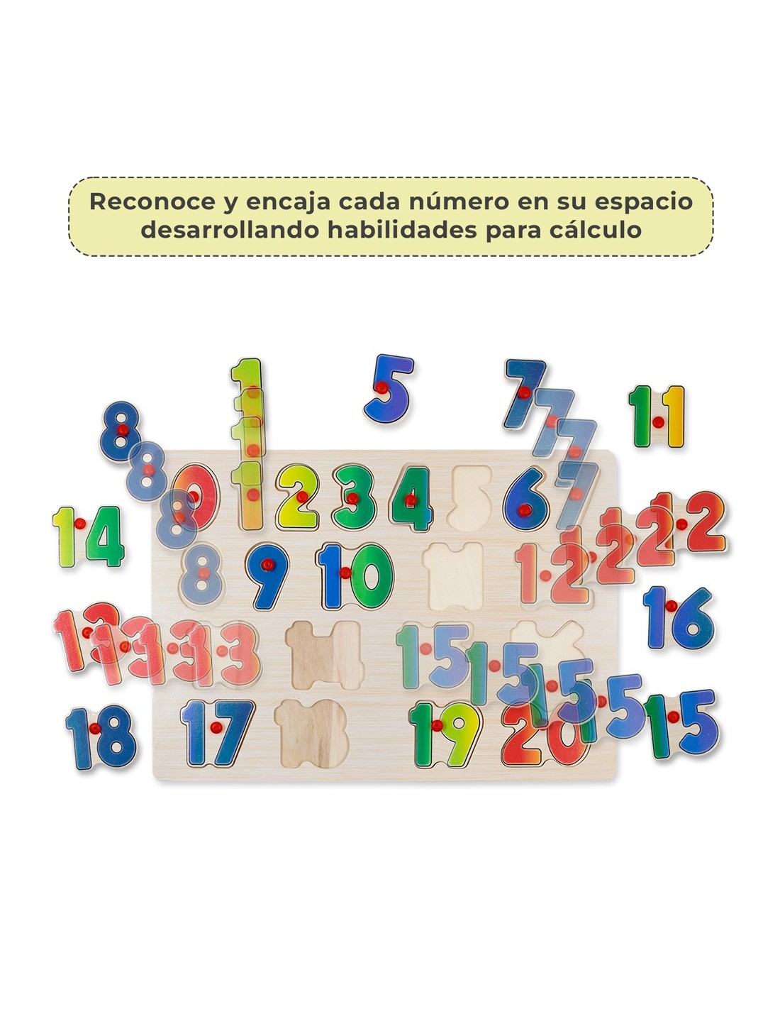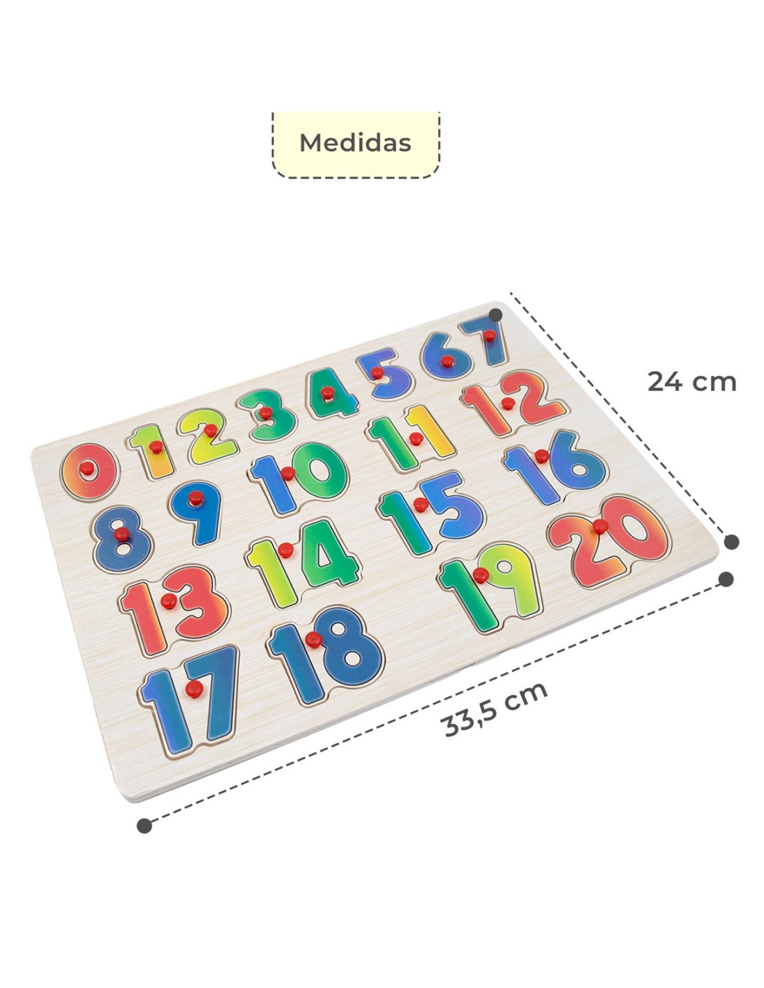 Explora los números del 1 al 20 de manera interactiva con este encajable diseñado especialmente para niños. Cada número está equipado con un pin de agarre que facilita su manipulación, mejorando las habilidades motoras finas.