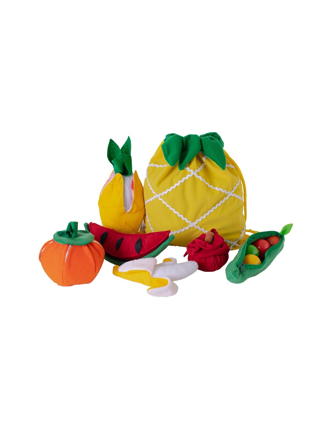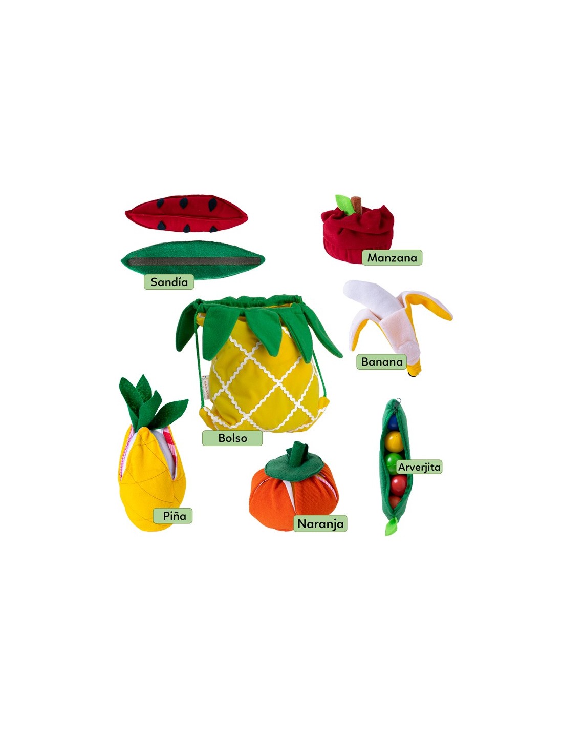 Este juego de frutas, hecho de fieltro y tela suave, es perfecto para sus manitas, ya que es seguro y muy divertido.