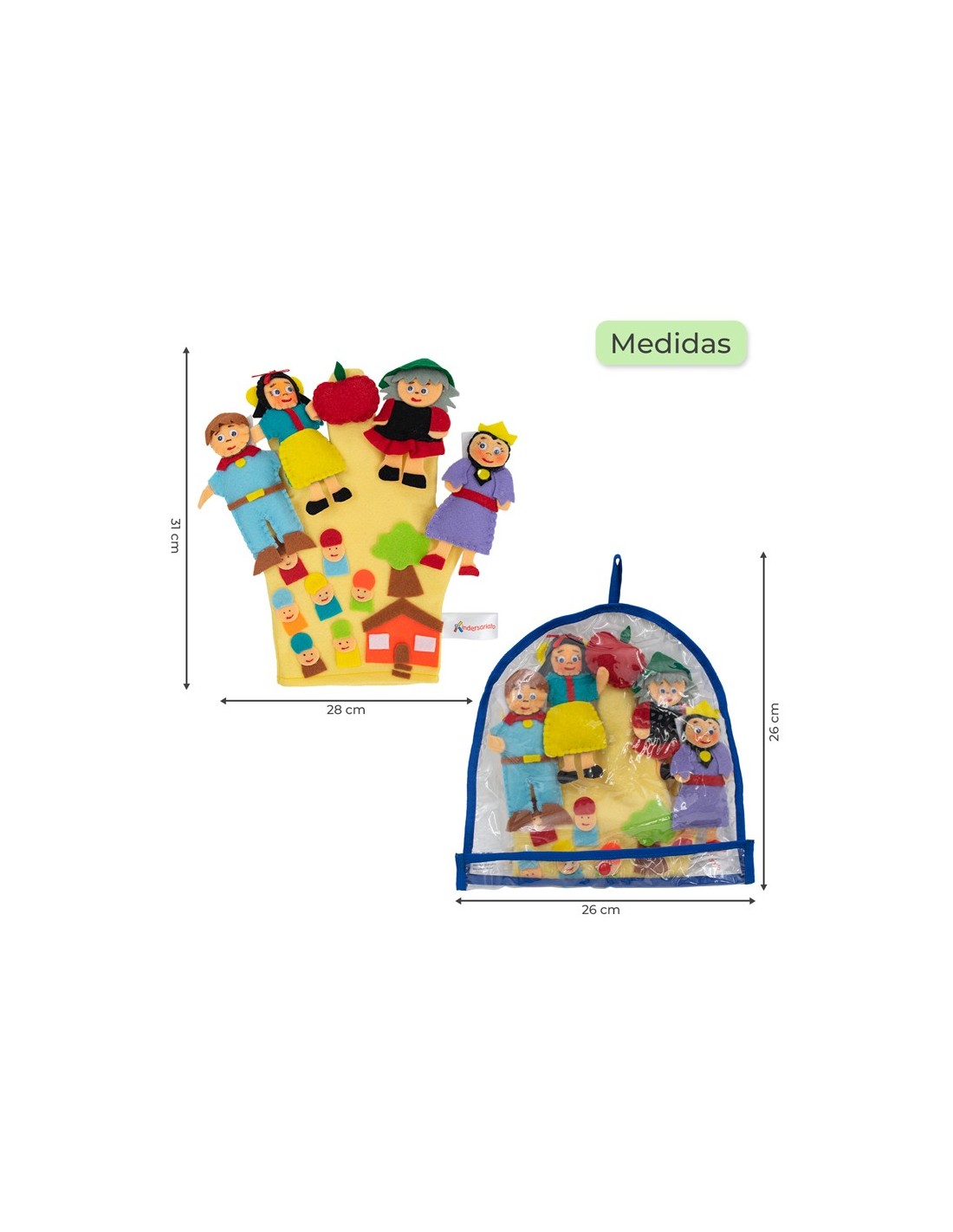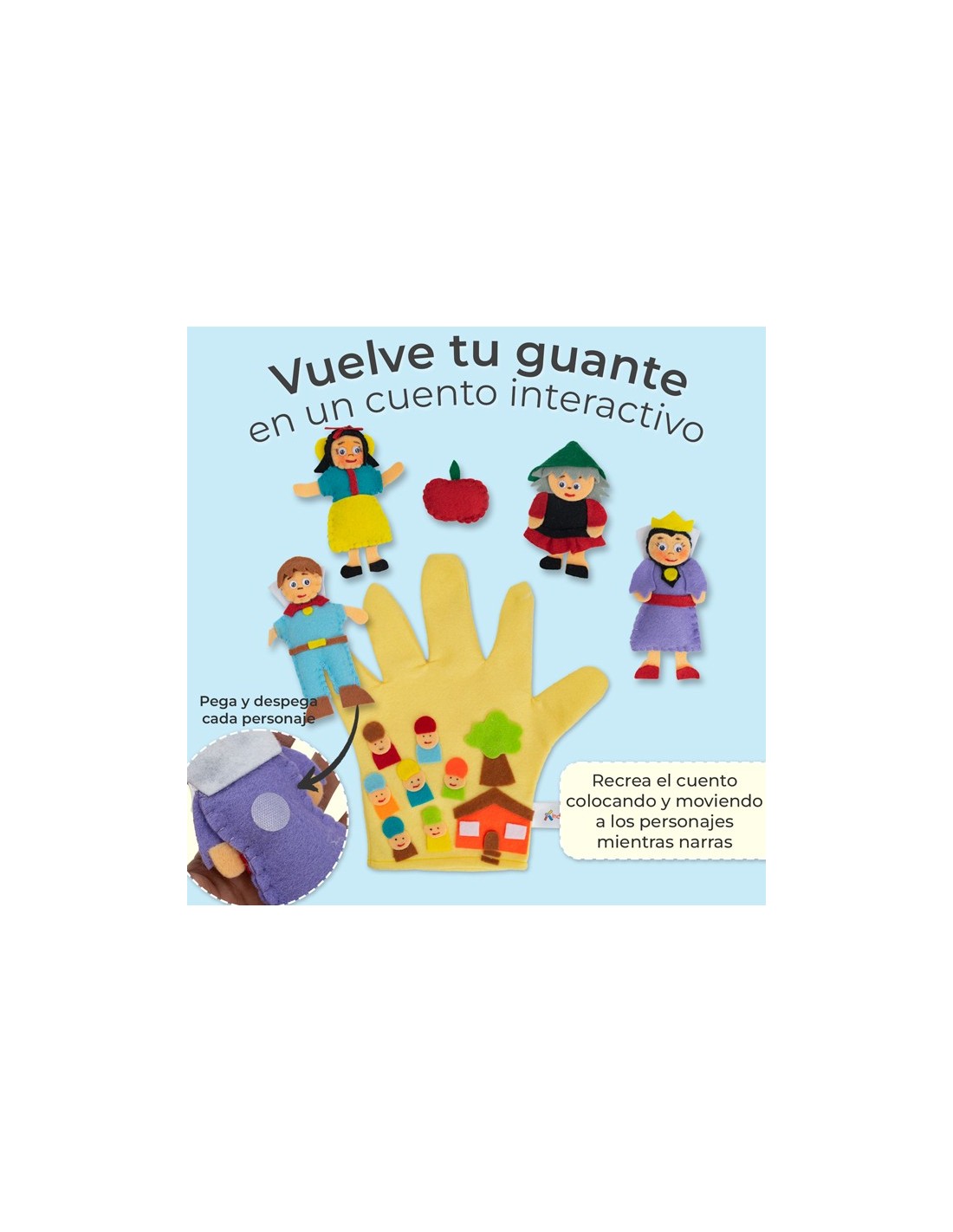 Los títeres sirven para desarrollar el lenguaje en los niños y niñas, además desarrollan el pensamiento creativo. Los títeres se caracterizan porque su movimiento depende de la mano del titiritero, además pega y despega a los personajes del guante para que puedas presentarlos durante la historia. Ideal para las habilidades de comunicación, la auto-confianza y el vínculo emocional padre-hijo. Acceso por la parte inferior del guante.