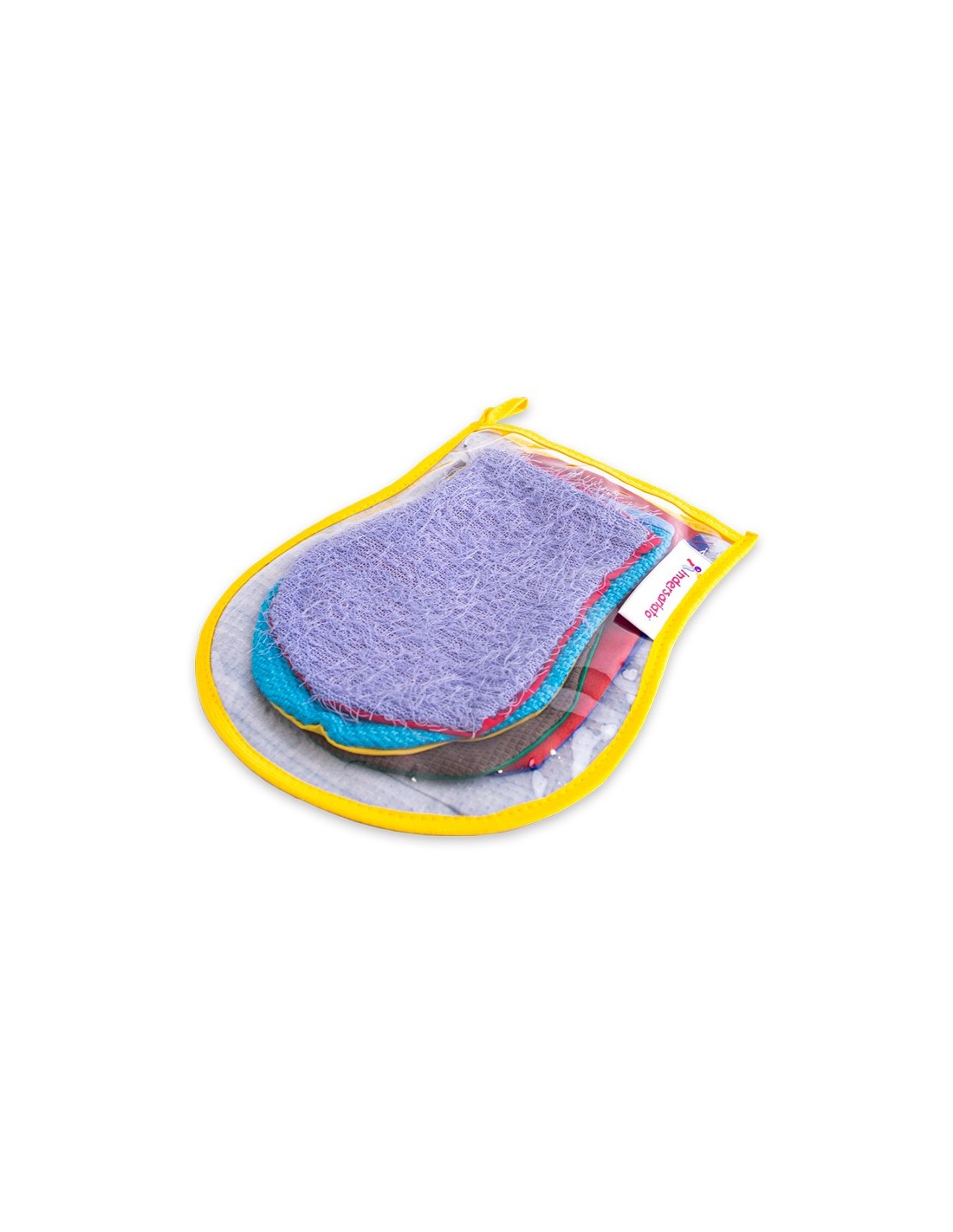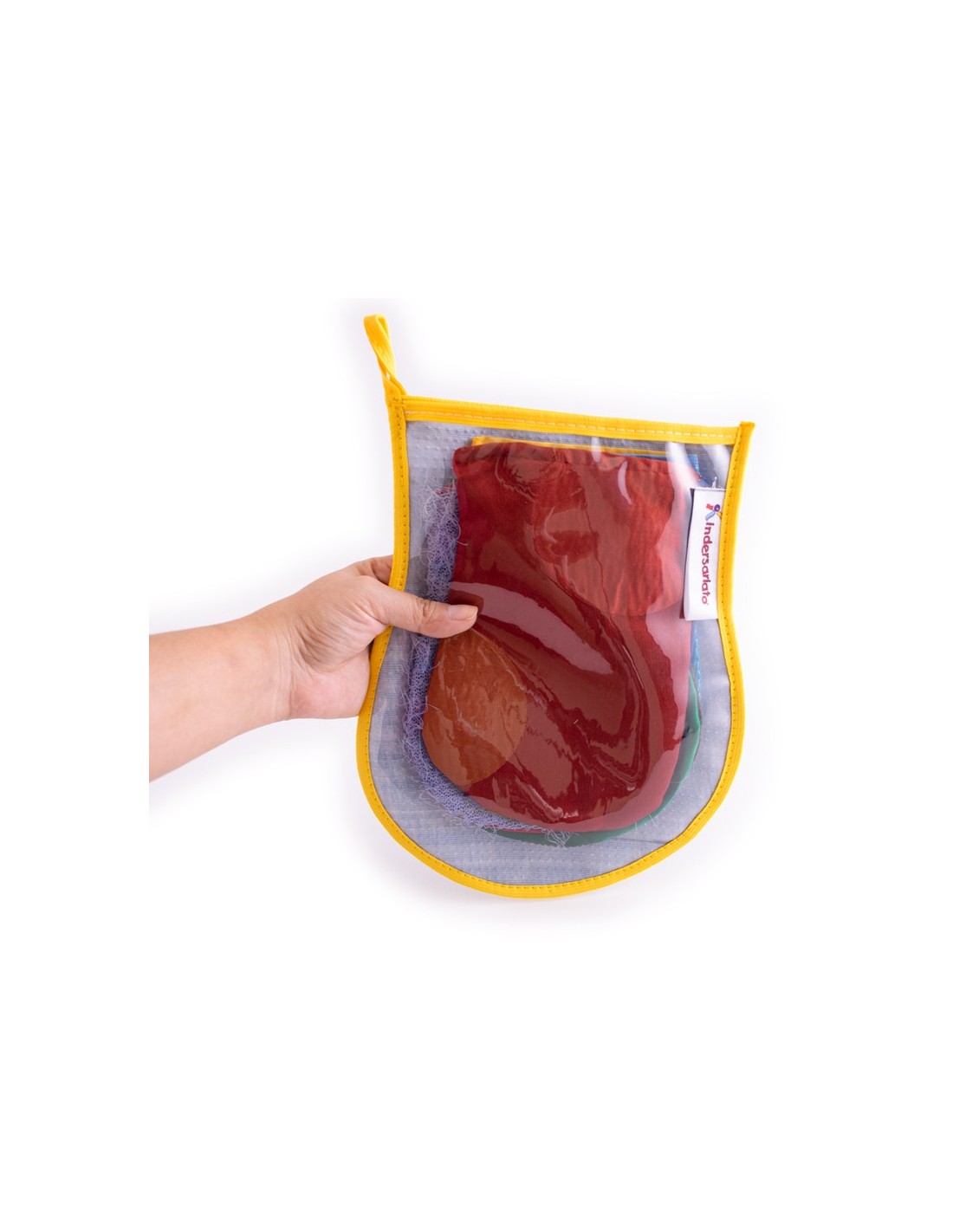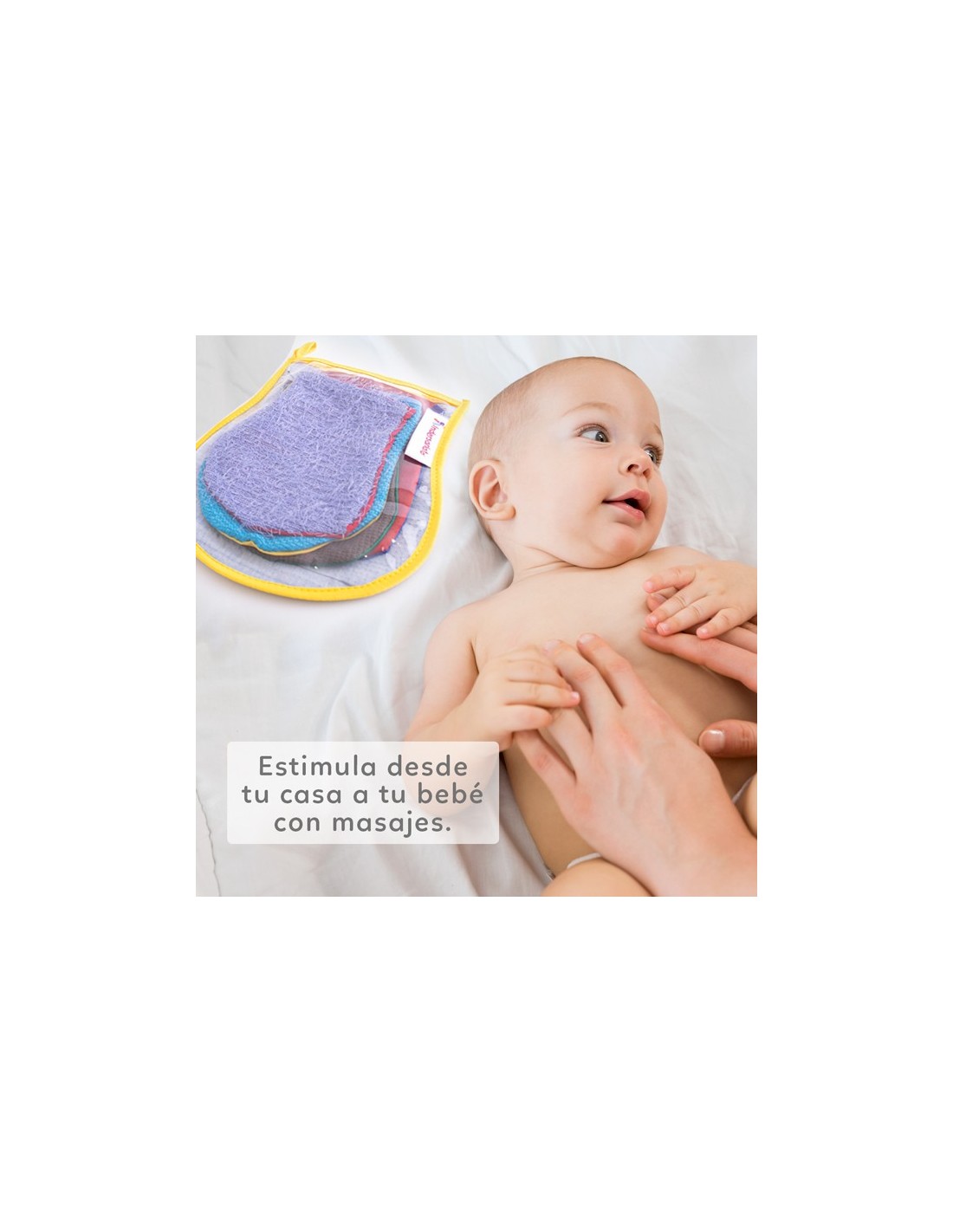 Set de 5 texturas diferentes en forma de guante que preparan a tu bebé al mágico mundo de las sensaciones. Este set de texturas viene en un práctico bolso para llevar.