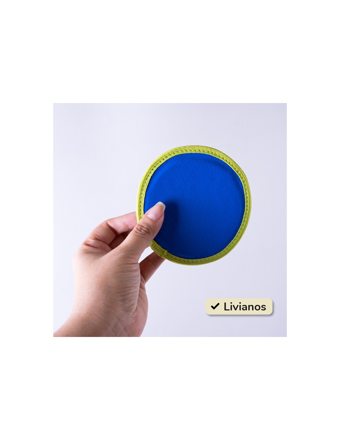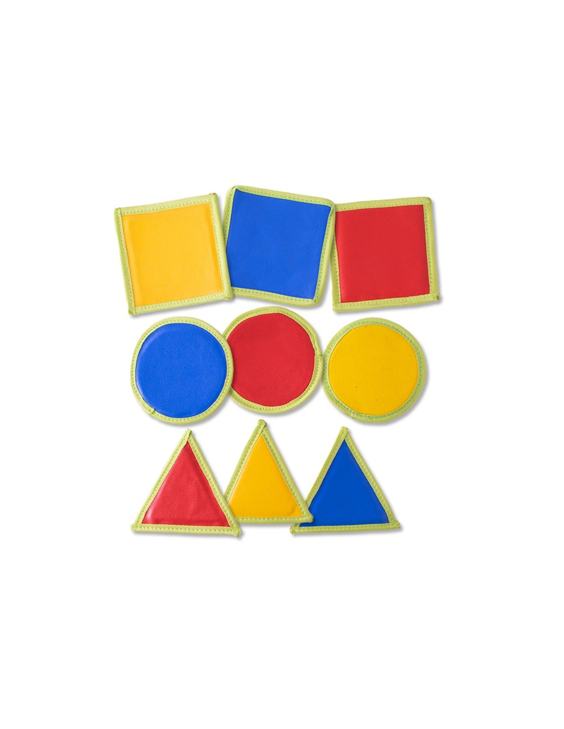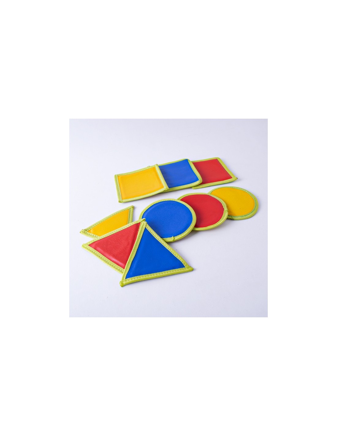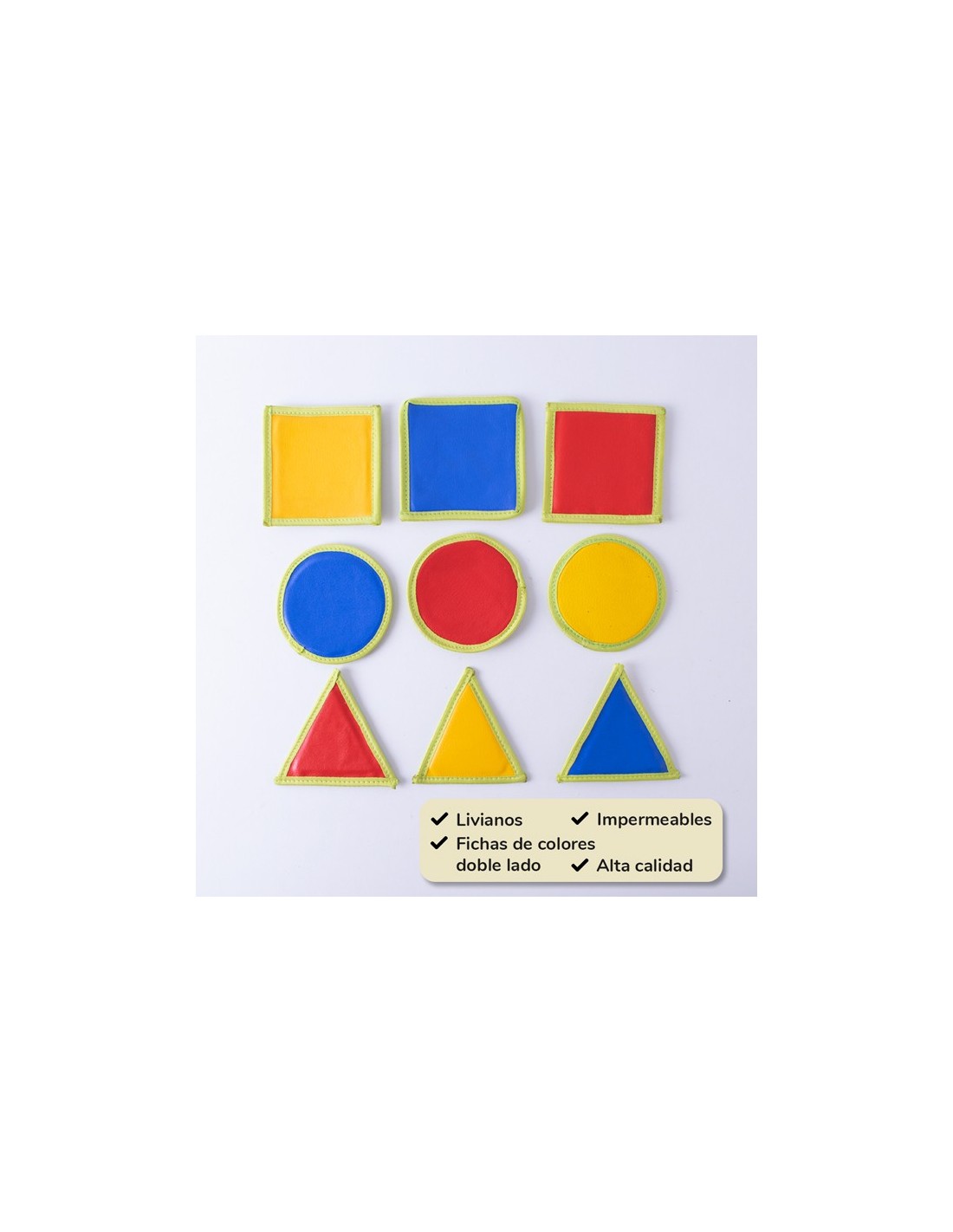 Figuras geométricas impermeables con colores de doble lado. Juega memoria virando cada ficha y encontrando el color que corresponde. Aprende las figuras geométricas y los colores. Material cosido. Son 9 figuras con colores de doble lado.