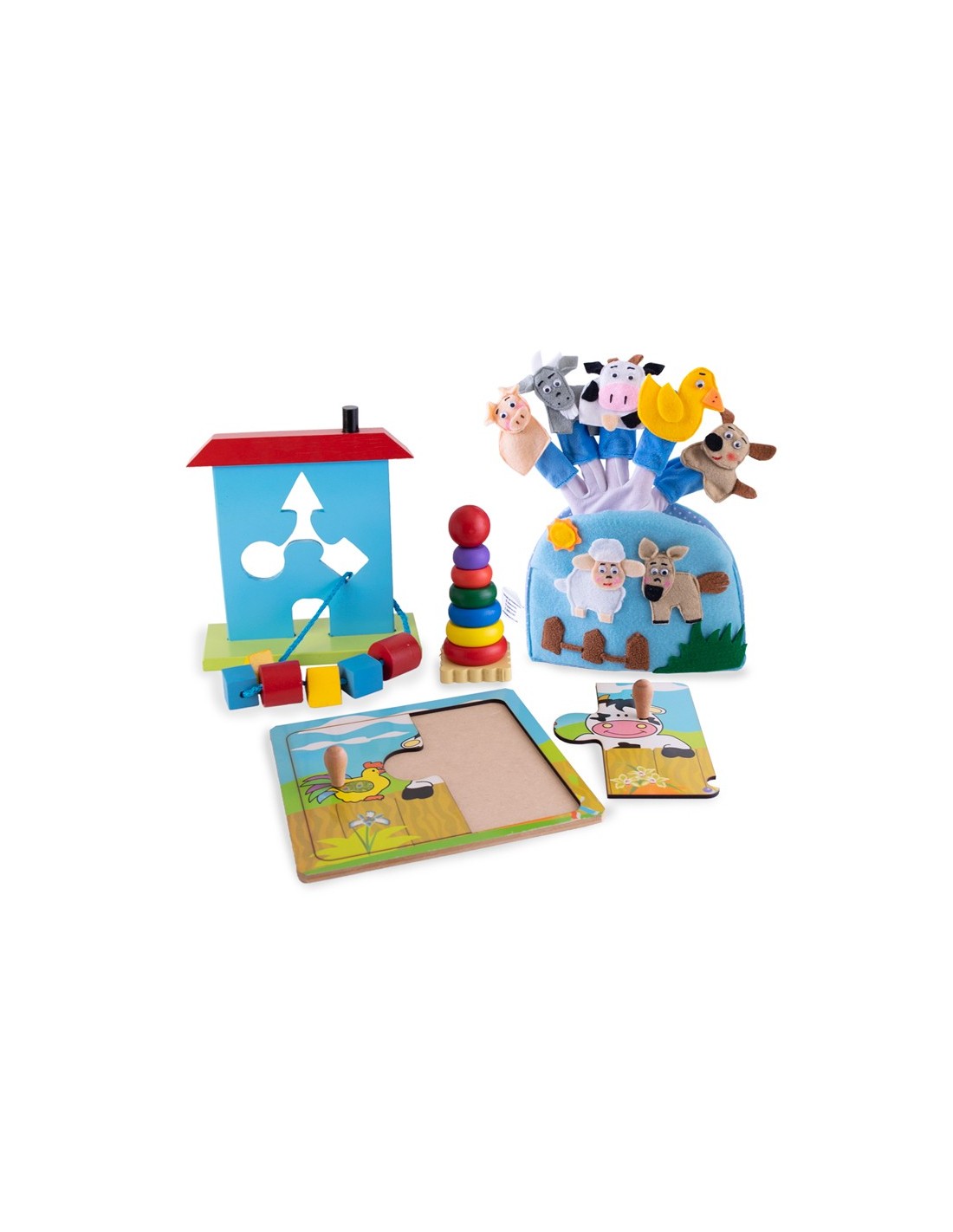 Juegos para apilar, manipular, torre para embonar y reforzar nociones básicas de tamaño, color, encaje de pocas piezas con o sin pines, casita de figuras geométricas para embonar por piezas de acuerdo a la forma. Un guante de títeres para cantar canciones, aprender nuevas palabras y sonidos de los animales. Guante de títeres para reforzar el lenguaje con canciones infantiles y sonidos de animales.