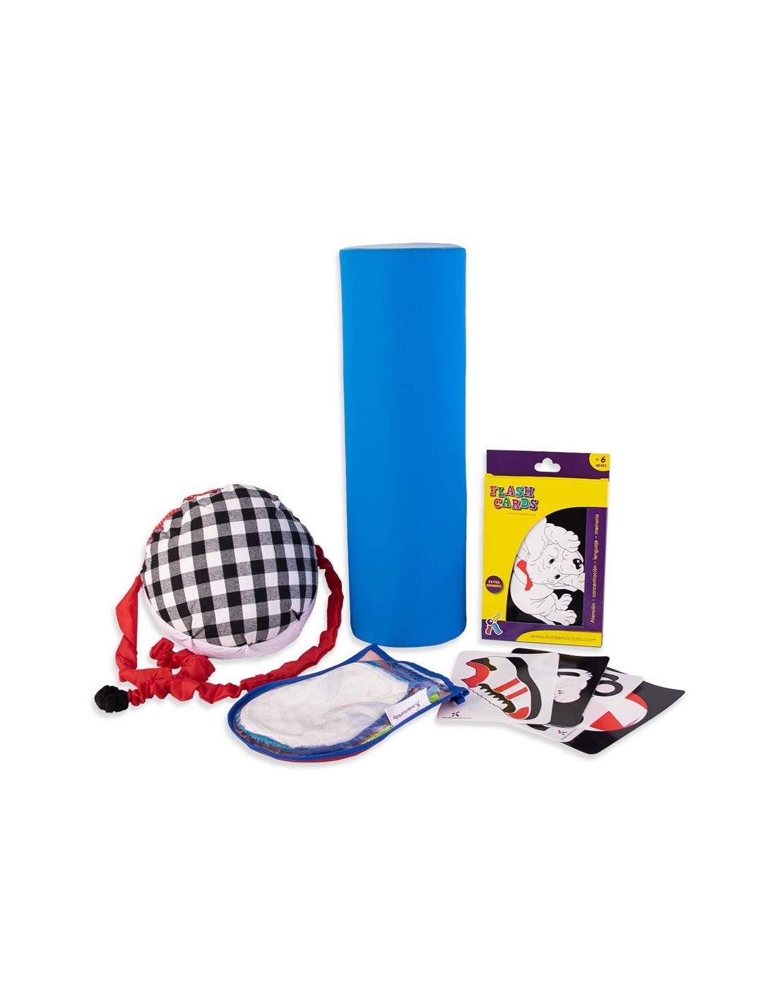 Kit para realizar actividades de estimulación temprana. Los implementos de este kit son necesarios en casa como material de apoyo. En pocos meses verás el progreso de tu bebé. Los guantes contienen 5 texturas para masajear a tu bebé. El rodillo es apoyo para realizar los ejercicios de gateo. Las tarjetas de observación visual en color blanco, rojo y negro, se debe a que ofrecen mayor contraste. Las tarjetas se muestran a una distancia de 25 cm. Balón sensorial elaborado en tela suave, se utiliza la manilla para sujetarla en la muñeca del bebé y el otro extremo se lo ubica en la cuna o se la sostiene con la mano de la mamá.