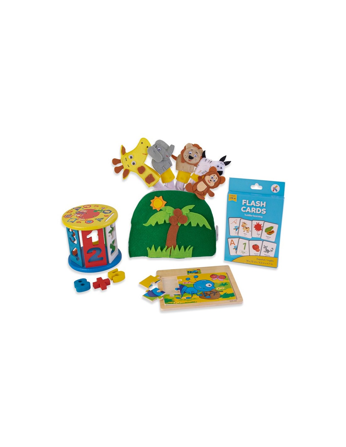 Juegos para encajar figuras geométricas por piezas de acuerdo a la forma. Un guante de títeres para cantar canciones, aprender nuevas palabras y sonidos de los animales. Guante de títeres para reforzar el lenguaje con canciones infantiles y sonidos de animales. Un rompecabezas de 12 piezas. Un paquete de 25 flashcards de animales salvajes.