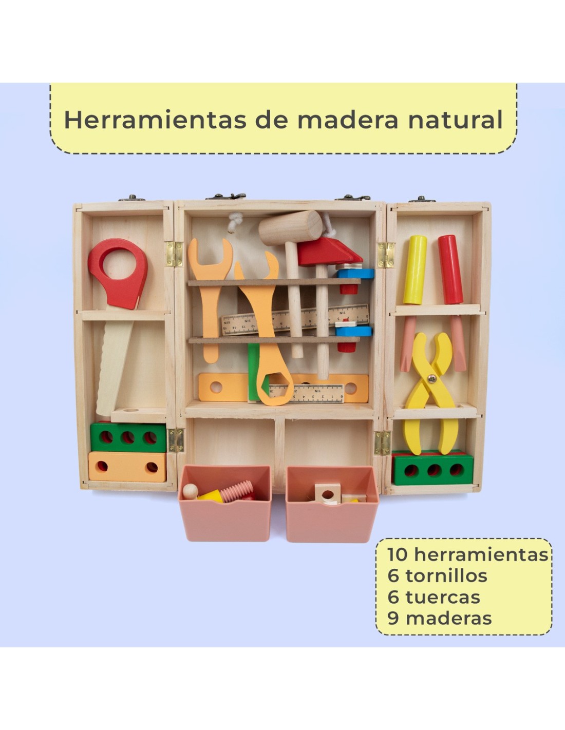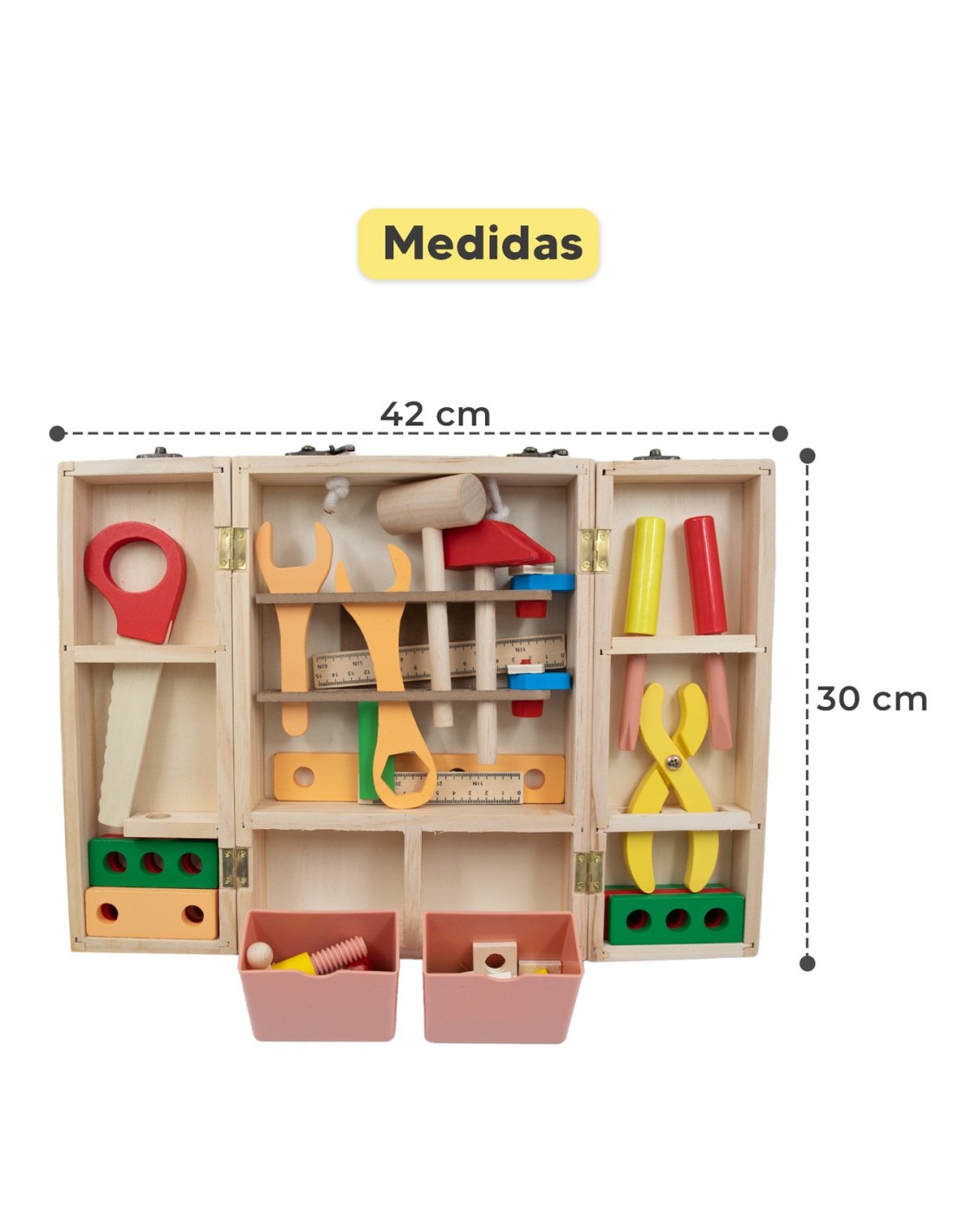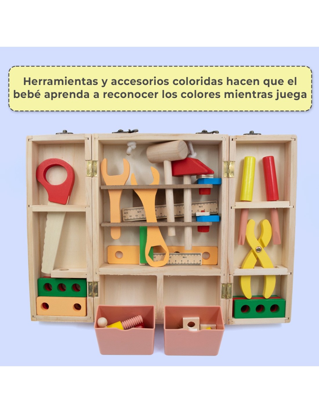 - El kit de herramientas de madera mantiene a tu hijo organizar bien sus herramientas, y con un asa en la parte superior, puedes llevarlo a todas partes.