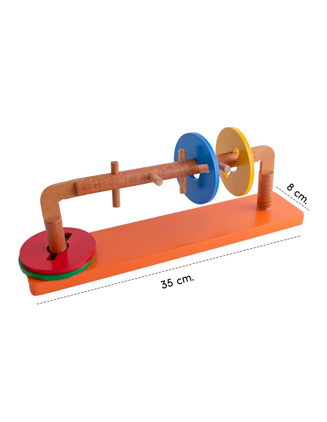 Juego de motricidad fina y pronosupinación para acondicionar la mano, muñeca, brazo y antebrazo. Laberinto de discos tiene como finalidad desarrollar el movimiento de la muñeca y los dedos de la mano. Consiste en girar las fichas para la derecha o izquierda con el objetivo de sacar cada ficha. Pero cada ficha tiene un obstáculo que no permite a la ficha salir del laberinto. Para vencer dicho obstáculo debes girar la ficha utilizando tu razonamiento lógico. Este movimiento llamado pronosupinación forma parte de la motricidad fina; que es la habilidad necesaria al momento de agarrar una cuchara, un lápiz, un crayón. Habilidades básicas y rutinas en la vida diaria del niño o el adulto mayor para ser autónomos e independientes.