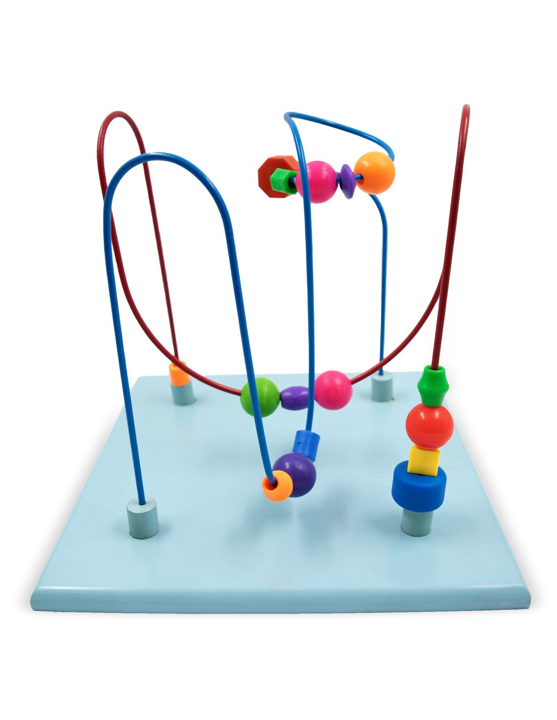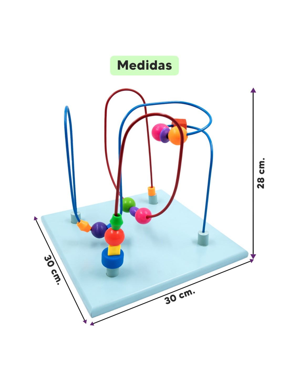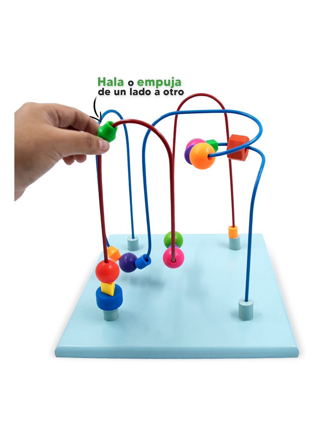 Laberinto metálico y piezas para halar o empujar. Contiene piezas dentro del laberinto que se mueven de un lado a otro. Promueve la destreza motriz coordinación mano-ojo y la creatividad para horas de diversión. Ejercita la planeación motora y la extensión y flexión lateral de la mano.