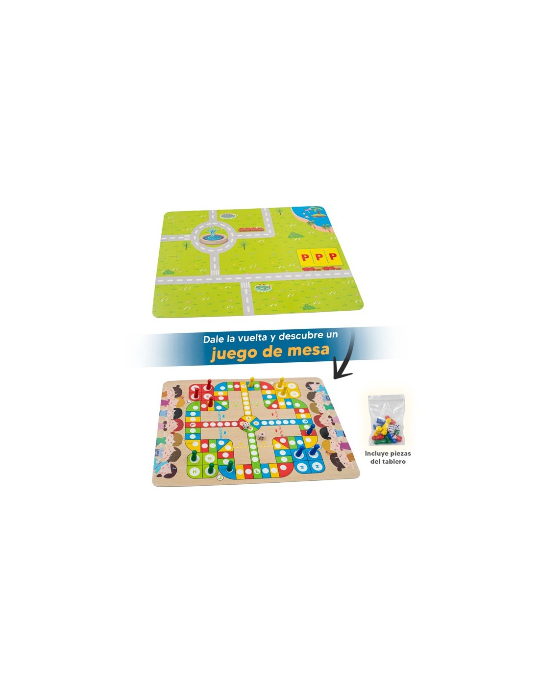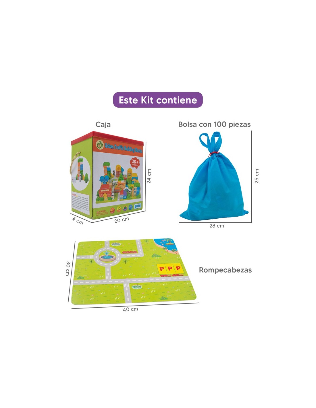 - 100 legos + 1 caja + 1 bolsa para transportarlos + 1 rompecabezas de 60 piezas (reversible) + 12 fichas para jugar + 2 dados