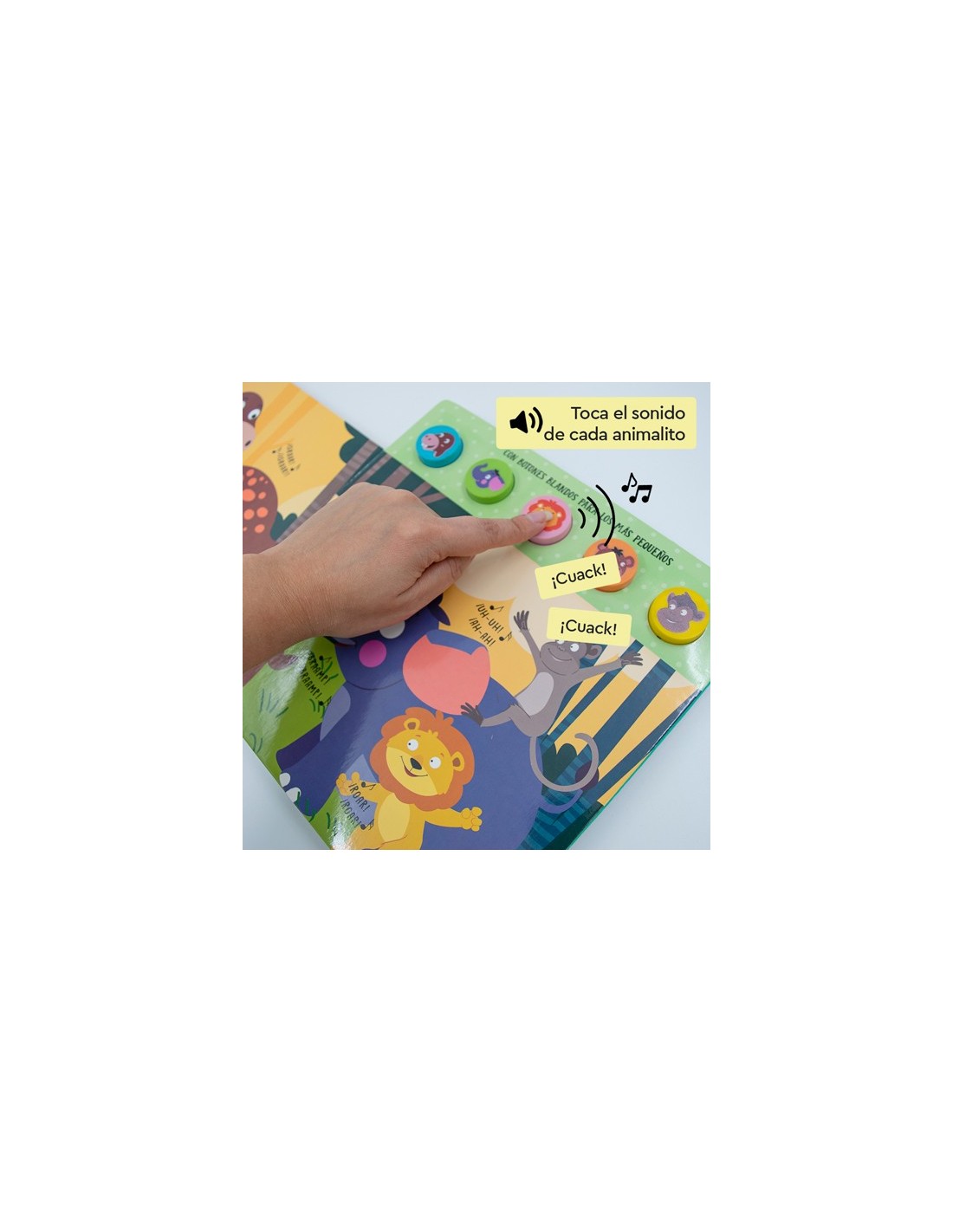 Libro sonoro elaborado en pasta dura con imágenes grandes y coloridas. Incluye dos baterías botón que deben ser reemplazadas solo por adultos.
