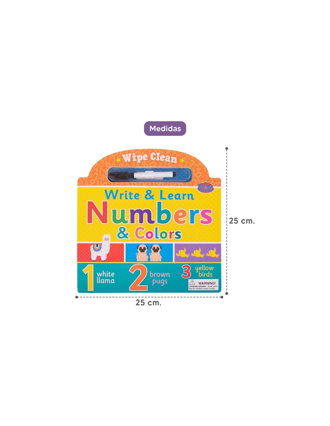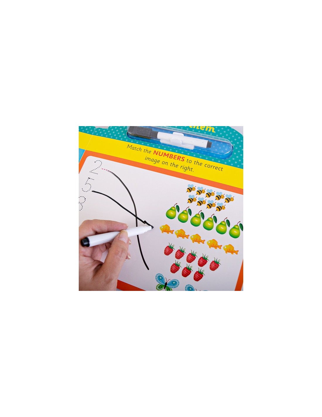 Páginas de actividades enfocadas en habilidades preescolares importantes, que incluyen: escribir escribir números, secuencias, colores, formas. Incluye un bolígrafo que se limpia con un paño y páginas de alto brillo que se limpian con un paño. Dirigido a niños de 3 a 5 años.