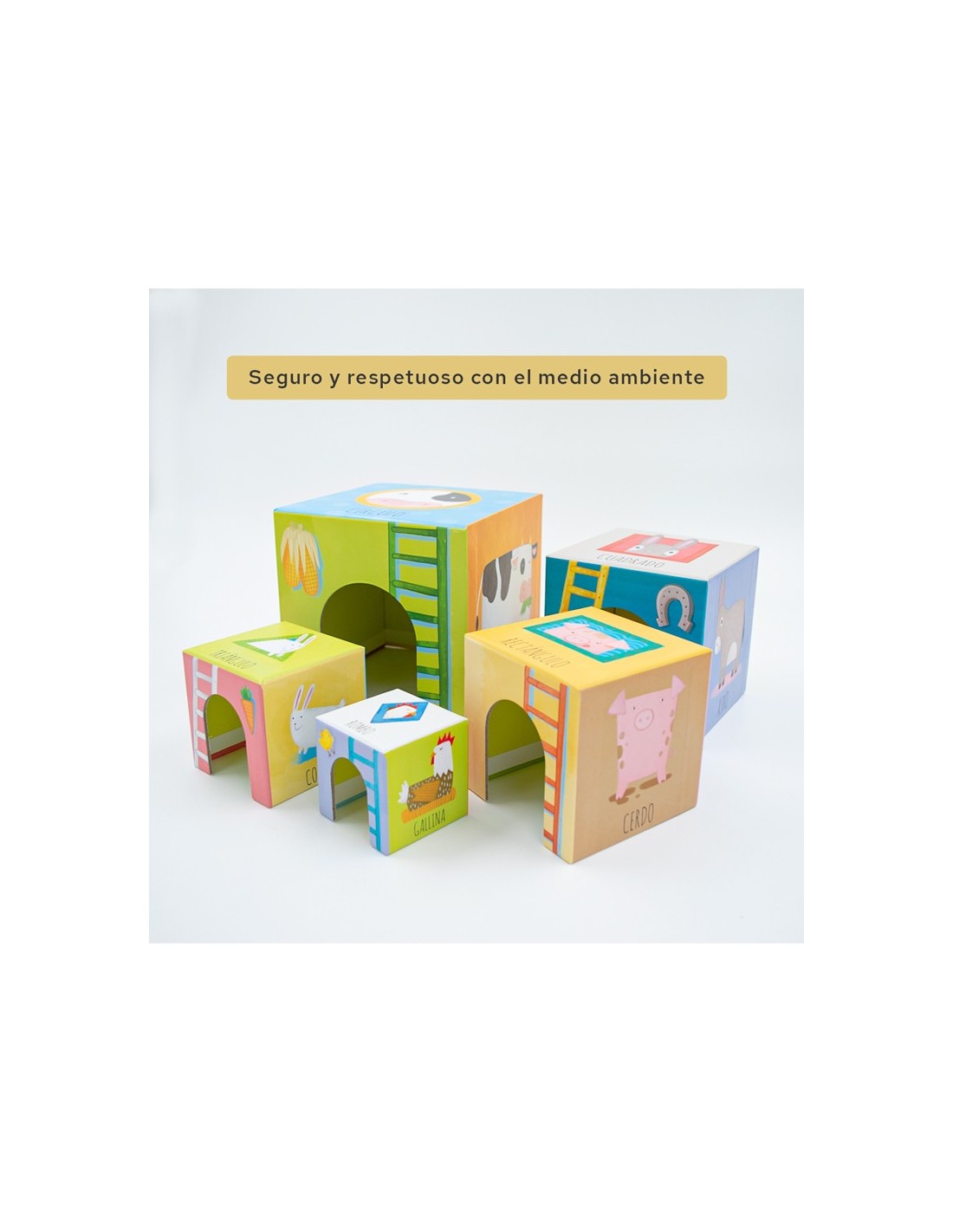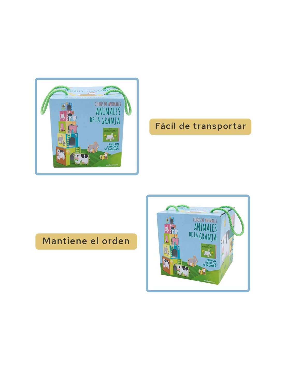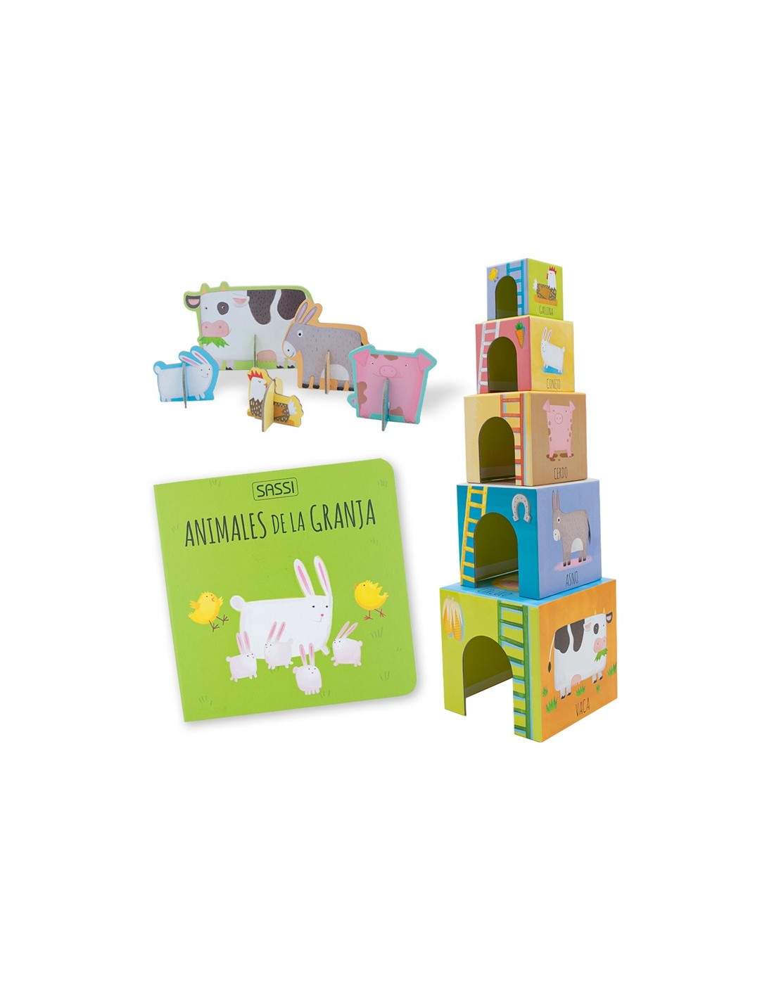 Un hermoso juego de cubos apilables de los animales de la granja, con figuras de cartón para jugar y un libro!