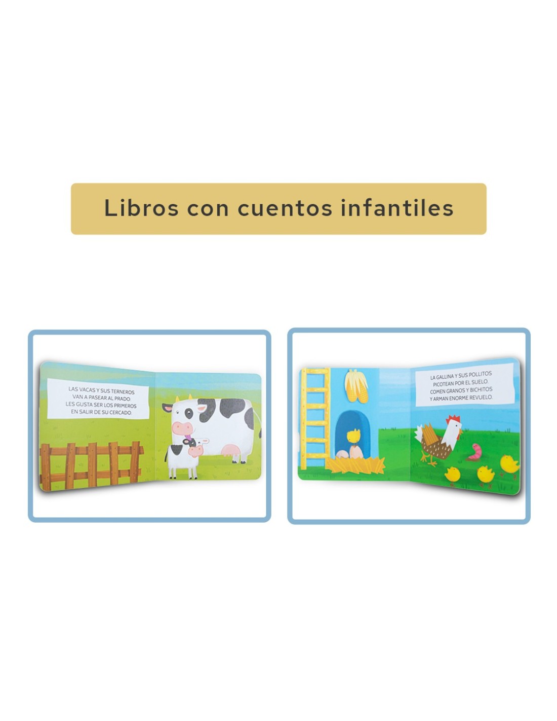 Es un hermoso día en la granja de animales, y los animales bebés están ocupados en sus quehaceres diarios con mamá y papá. Sigue a los pollitos, conejos, burros, terneros y lechones. Construye una torre con los cinco bloques de construcción y juega junto con las cinco figuras de los animales bebés presentados en el libro.