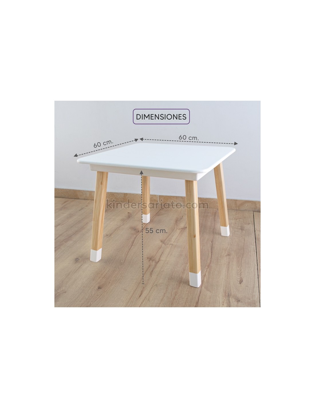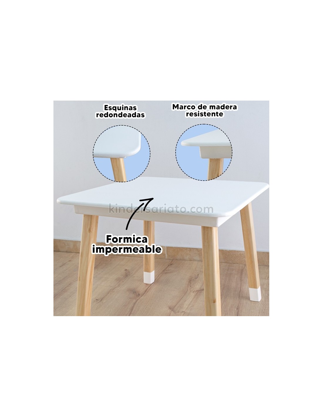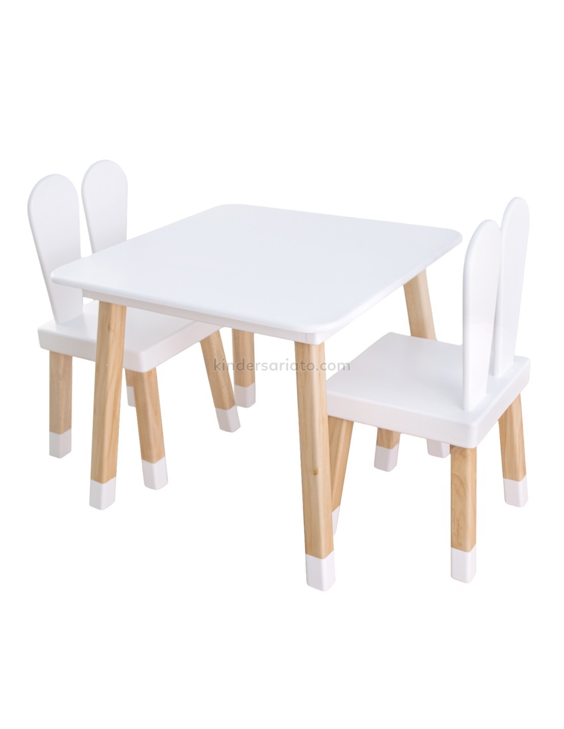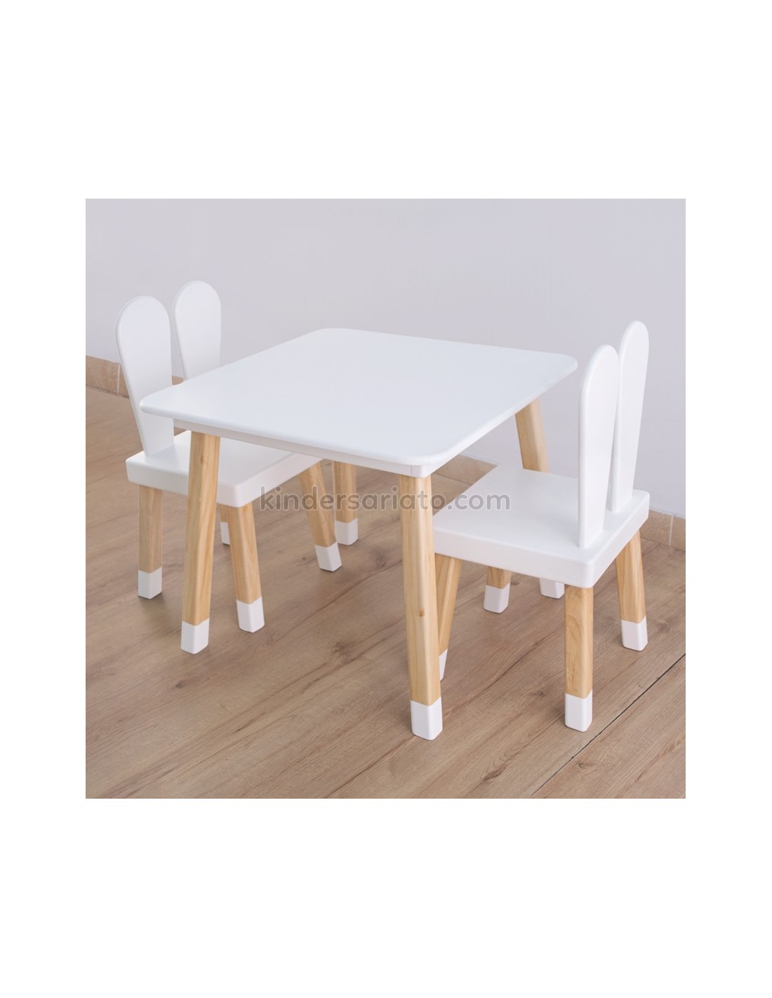 Mesa cuadrada de madera con 2 sillas en modelo “conejo”. Base de mesa con estructura reforzada. Sistema de pernos invisibles. El set contiene 1 mesa con 2 sillas.