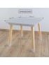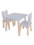 Mesa cuadrada de madera con 2 sillas en modelo “conejo”. Base de mesa con estructura reforzada. Sistema de pernos invisibles. El set contiene 1 mesa con 2 sillas.