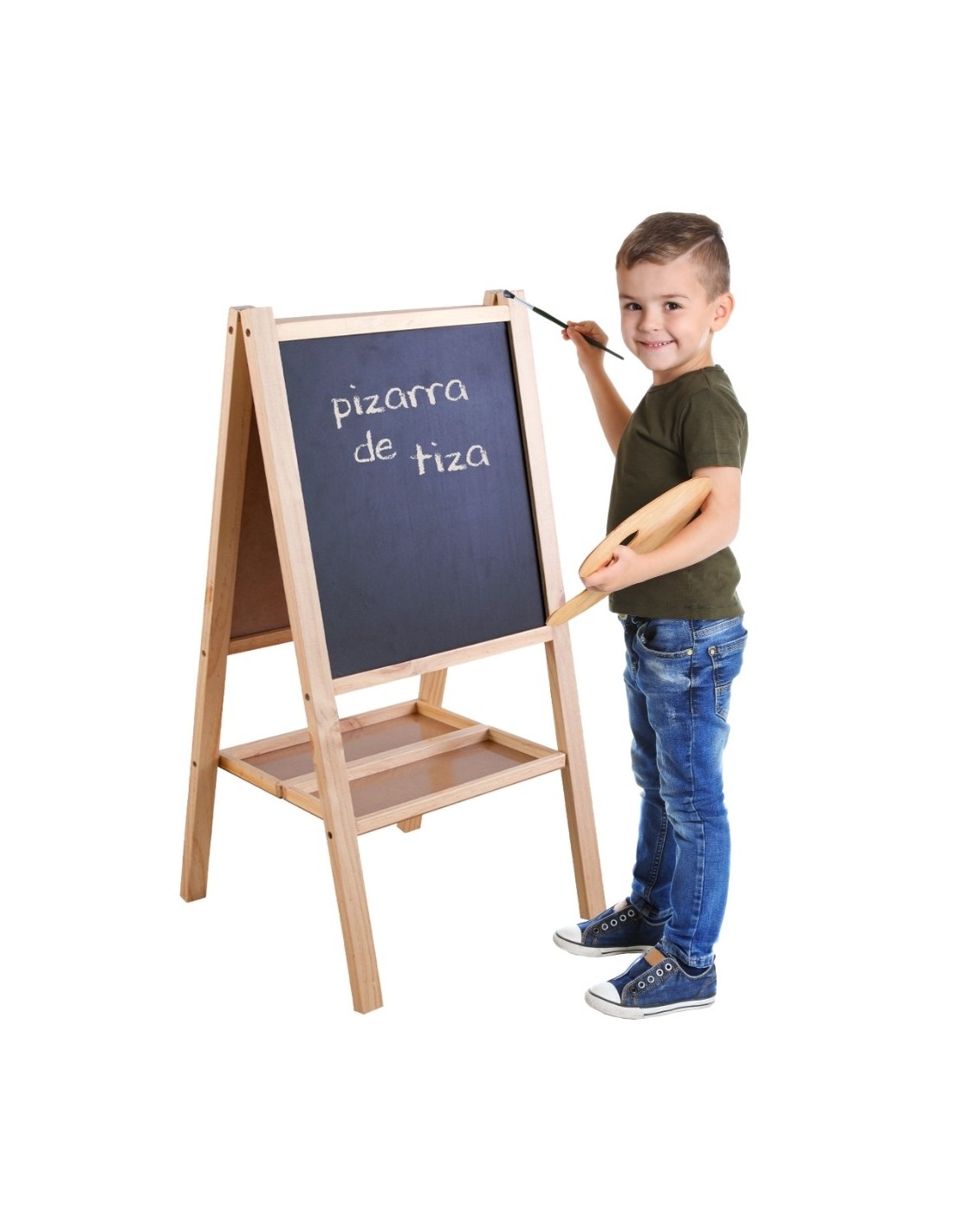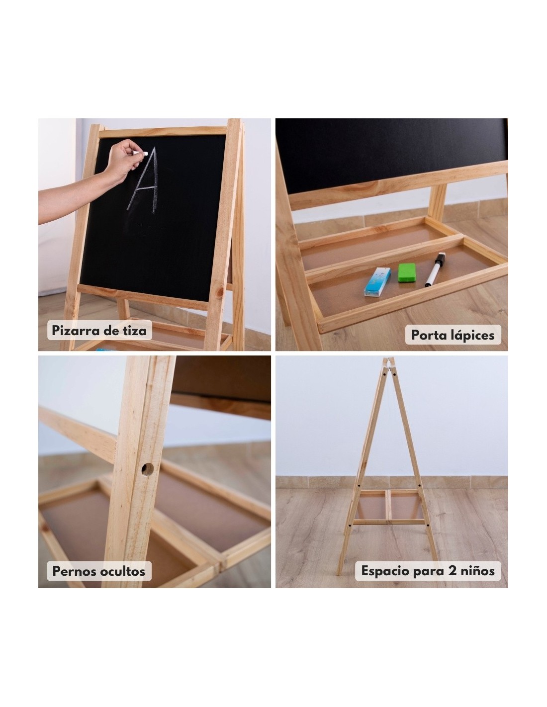 - Pizarra de tiza, pernos ocultos, estable de madera, compartimientos para lápices y pinceles.