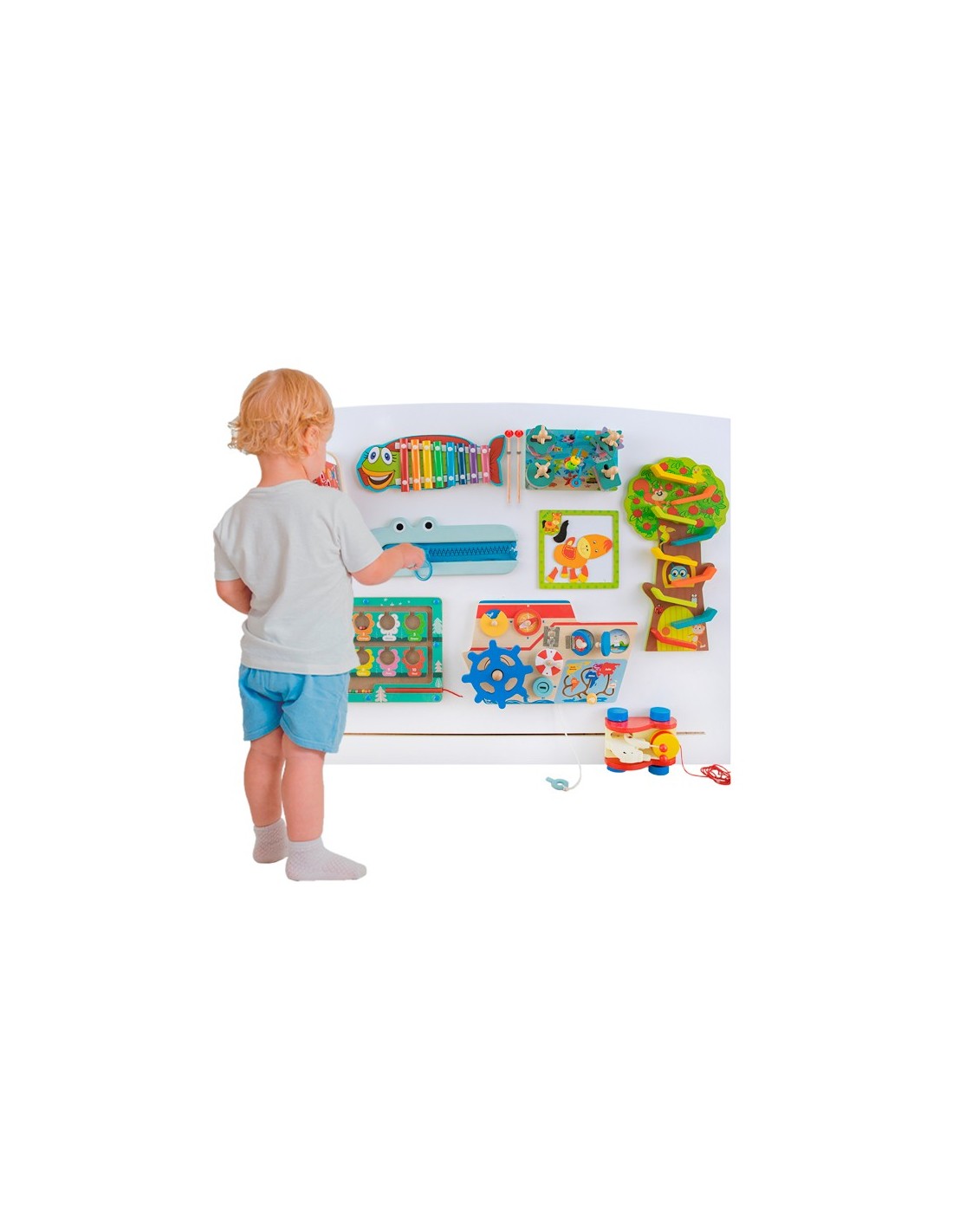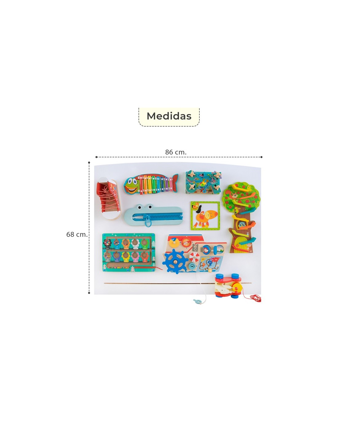 Esta innovadora tabla Montessori de madera esta diseñada para desarrollar habilidades motoras finas a través de actividades básicas como botones, cremallera, encajes. Además, el tablero Montessori es beneficioso para los niños en reconocimiento visual al ayudarlos a identificar diferentes formas y colores. Es de fácil instalación, con todos los accesorios incluidos para ubicarlo en la pared de tu casa. Ayuda a ahorrar espacio en tu hogar.
