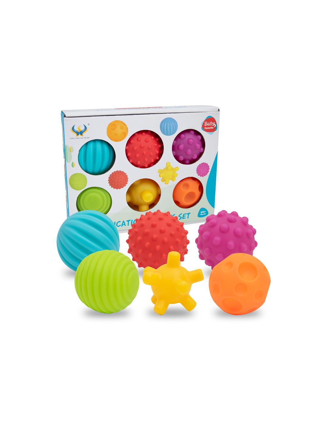 Set de 6 pelotas sensoriales con diferentes texturas, colores y formas que estimulan el desarrollo táctil, visual y motor de los niños. Ideales para bebés a partir de 6 meses. Suaves, seguras y fáciles de manipular. Perfectas para jugar, explorar y aprender con las manos.