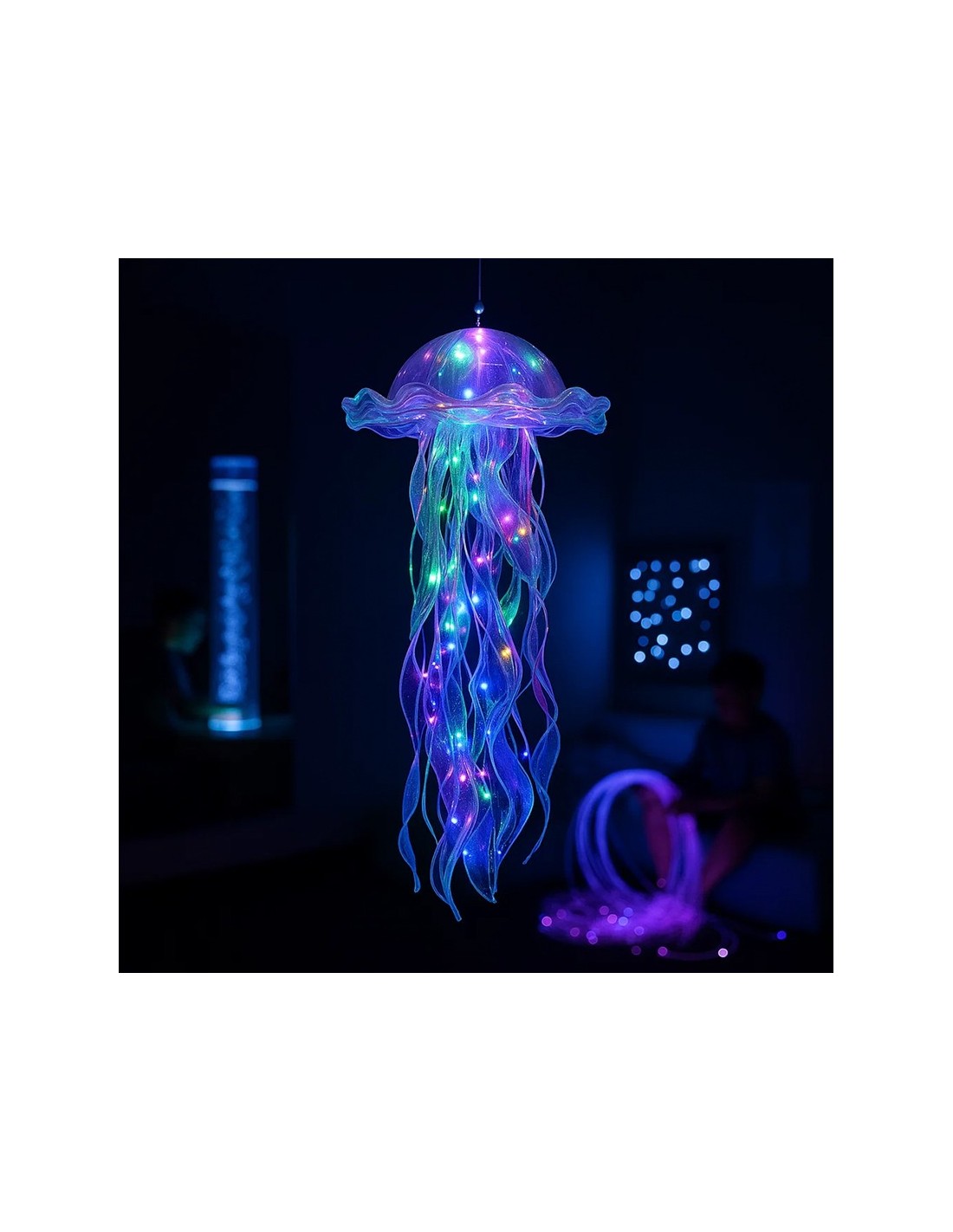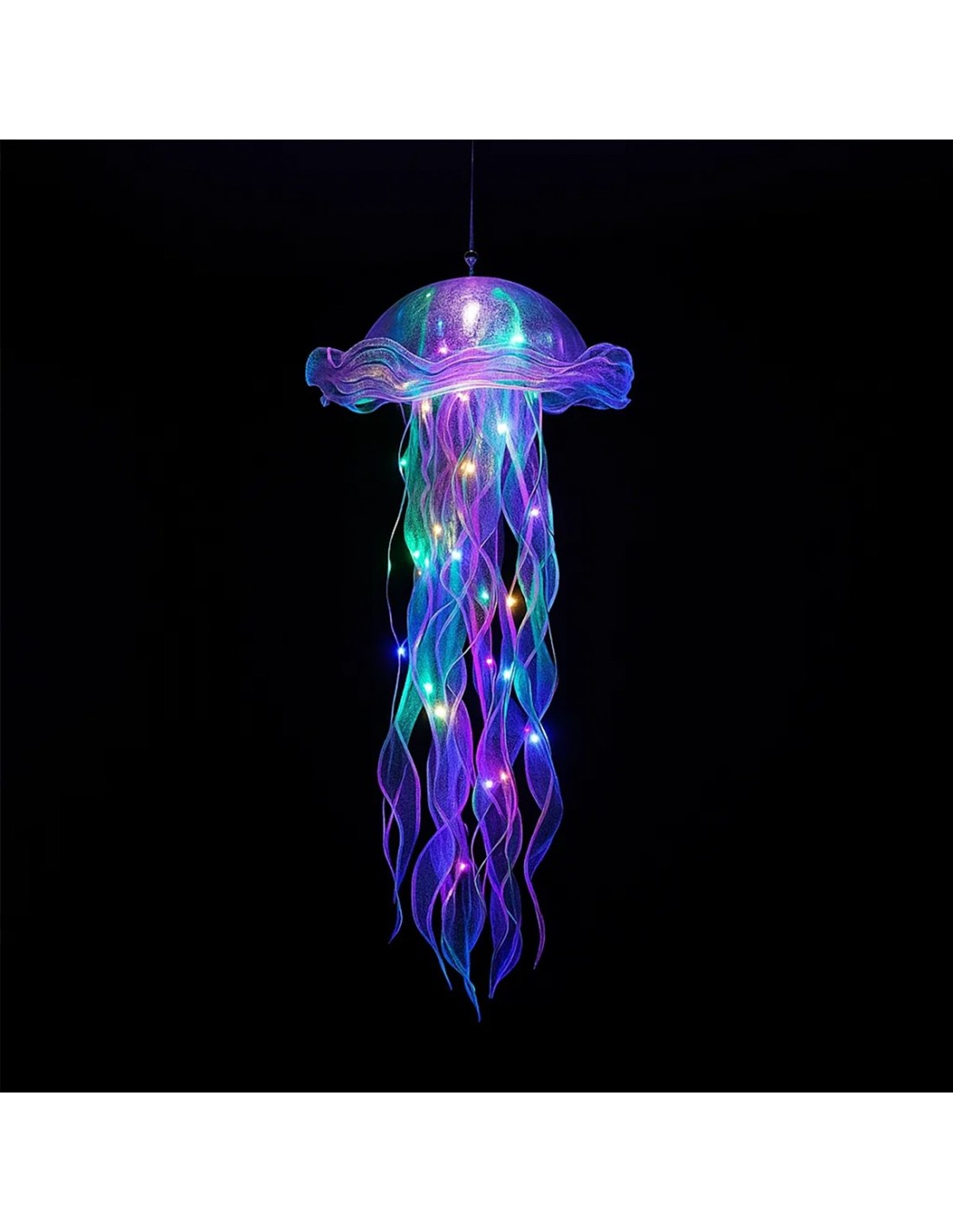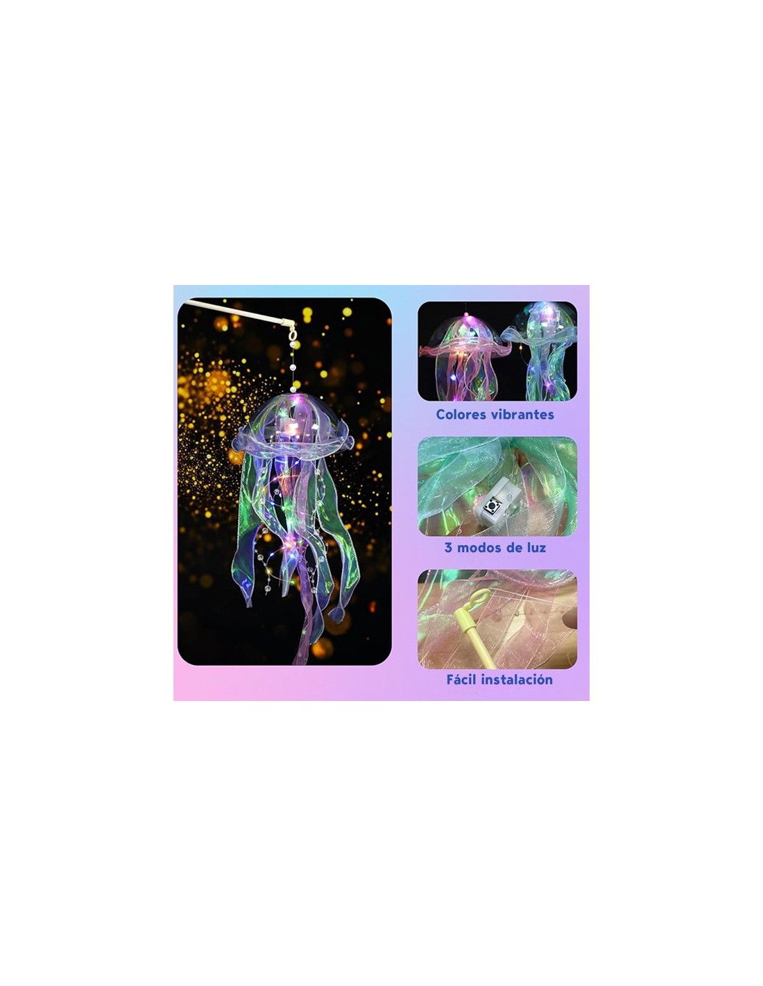 Pack de 3 faroles colgantes con diseño de medusas iluminadas, ideales para decorar interiores o exteriores. Emiten una luz suave y mágica al anochecer, creando un ambiente etéreo y vibrante. Cada medusa incluye cintas reflectantes que realzan su efecto marino y encantador.