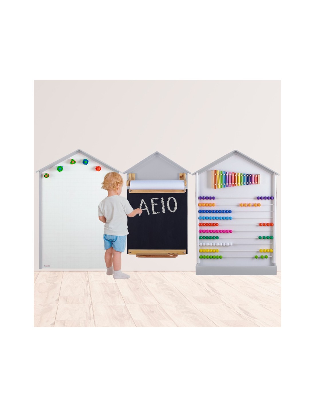 Set de 3 paneles elaborados en madera para instalar en la pared, incluye 1 panel de pizarra borrable imantada, 1 panel de portarollo (incluye rollo de 30 metros), 1 panel con ábaco gigante con xilófono de 15 notas.