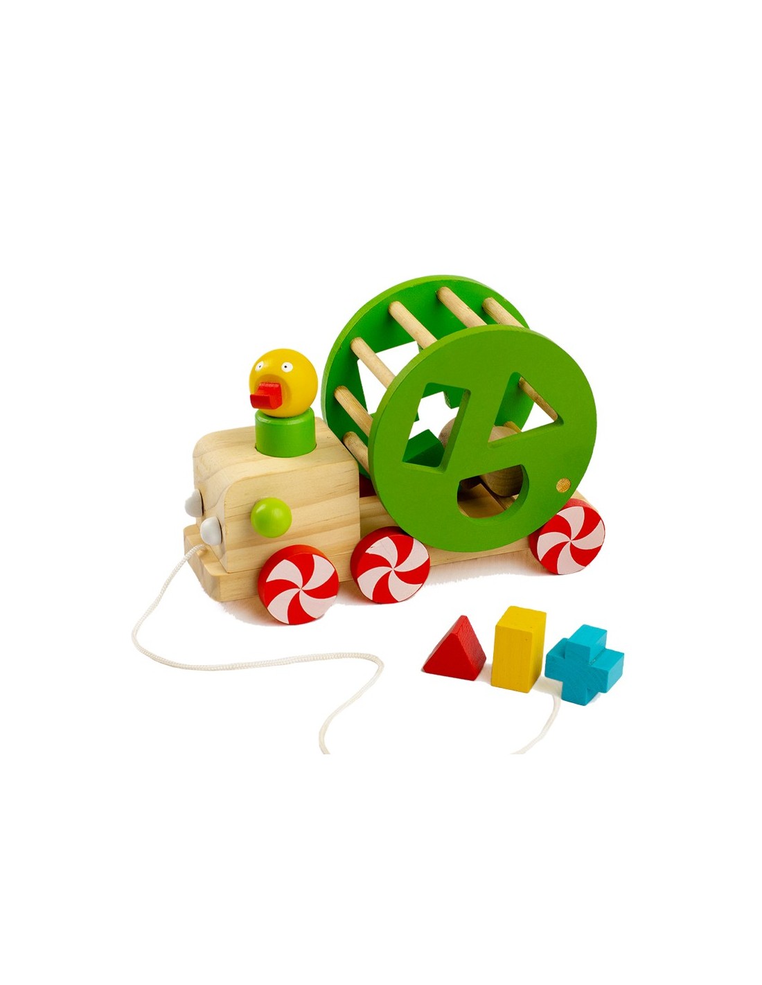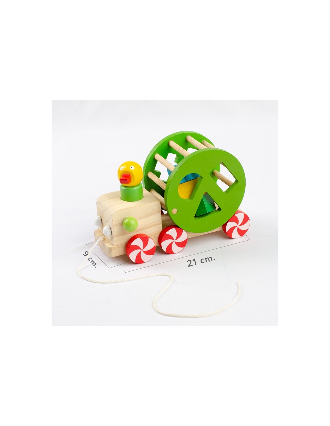 Alcancía de figuras geométricas en madera con forma de pato. Tiene ruedas para arrastrarlo. Este maravilloso juguete didáctico funciona encajando las piezas dentro de la alcancía. Las piezas son figuras geométricas en madera que se encajan según la forma. Además el carrito tiene una piola para arrastrarlo. El producto viene dentro de una caja de cartón. El producto mide 21 cm. x 9 cm.