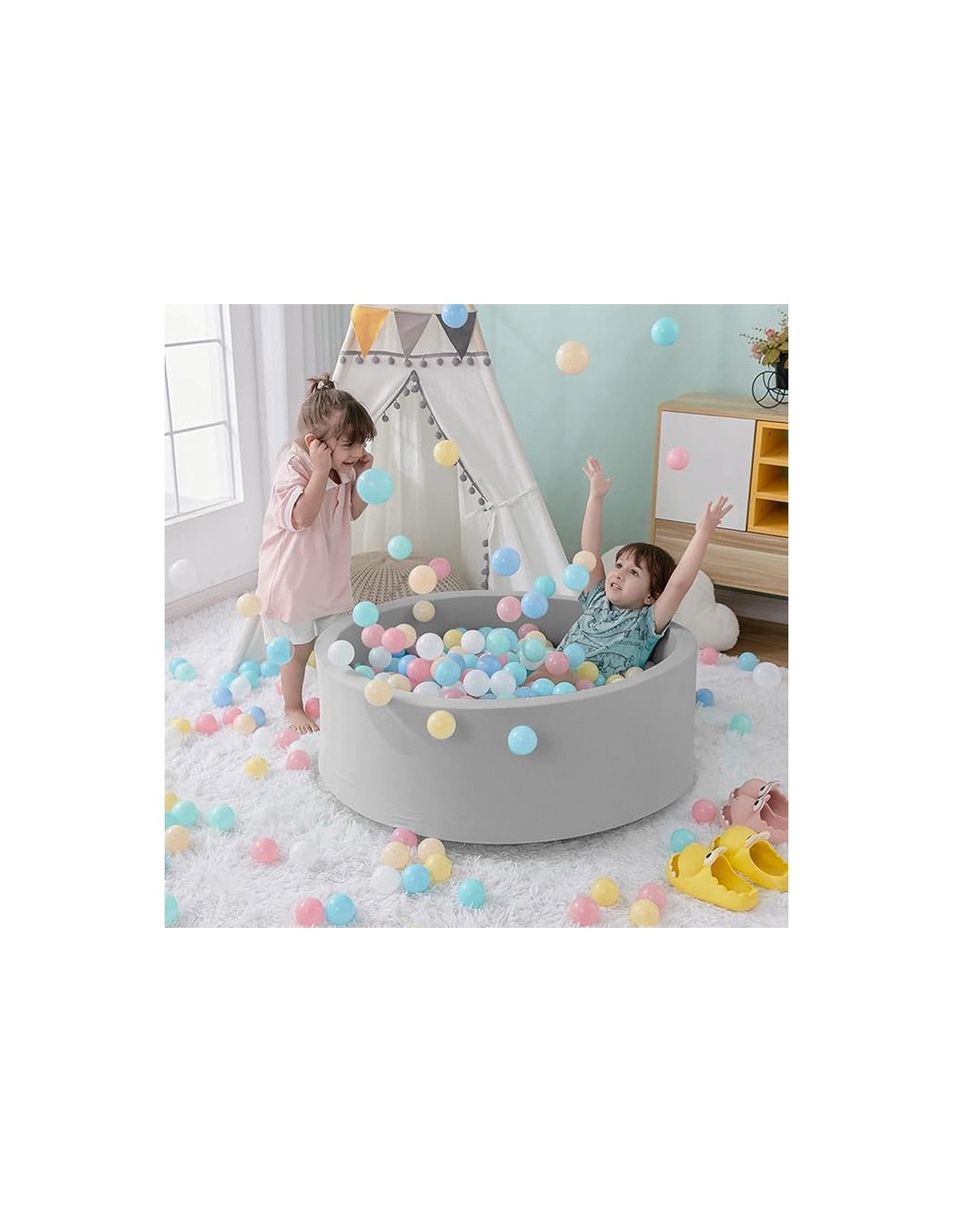 En cuanto a la seguridad y el confort, el interior de las pelotas está fabricado con una espuma viscoelástica de alta calidad de 5 cm de grosor, que ofrece una excelente amortiguación y no es tóxica. La superficie está hecha de un tejido suave y agradable al tacto. Es el lugar ideal para que los niños jueguen con total seguridad, además de ser una solución perfecta para las mamás, ya que les permite disfrutar de un merecido tiempo personal mientras sus pequeños se divierten.