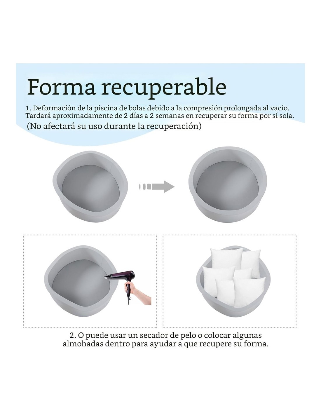 - Diseño a prueba de vacío: La piscina viene sellada al vacío. Cuando saques la esponja, se expandirá rápidamente, aunque no formará un círculo perfecto de inmediato. Puedes dejarla en reposo de 2 días a 3 semanas para que recupere su forma. Utilizar un secador de pelo en temperatura moderada o rellenar el espacio vacío con almohadas y mantas puede ayudar mucho en este proceso. ¡No te preocupes, la recuperación no afectará el uso!