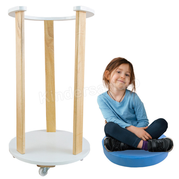 Módulo porta-pouffes de madera Guayacán Blanco con ruedas, diseñado para almacenar y transportar hasta 12 pouffes. Su estructura resistente y compacta permite ahorrar espacio, mantener el orden y facilitar la movilidad en aulas, bibliotecas, centros de terapia o rincones de lectura.