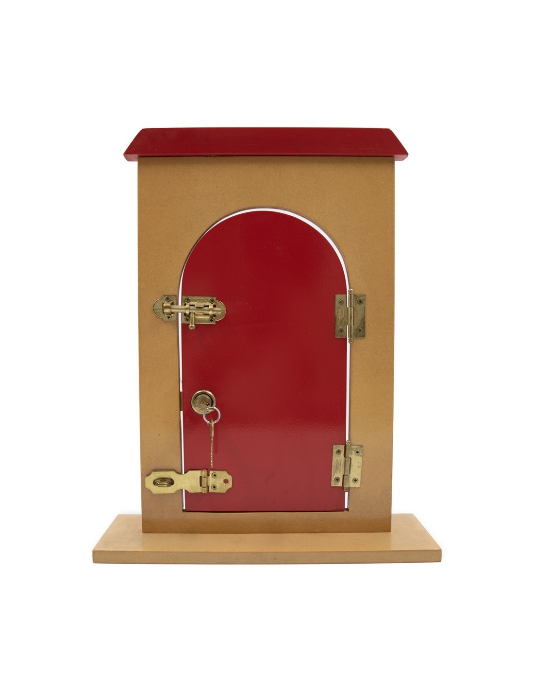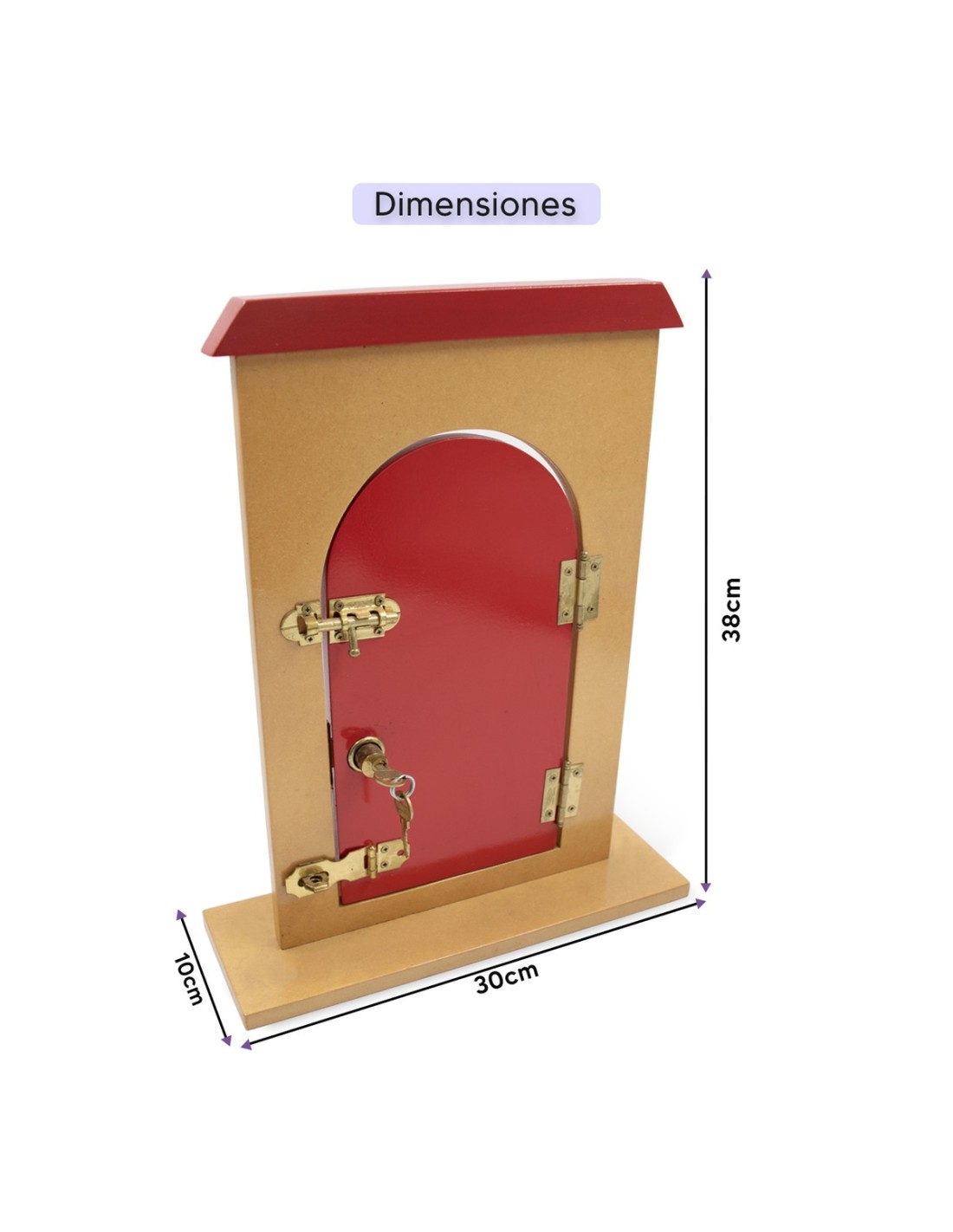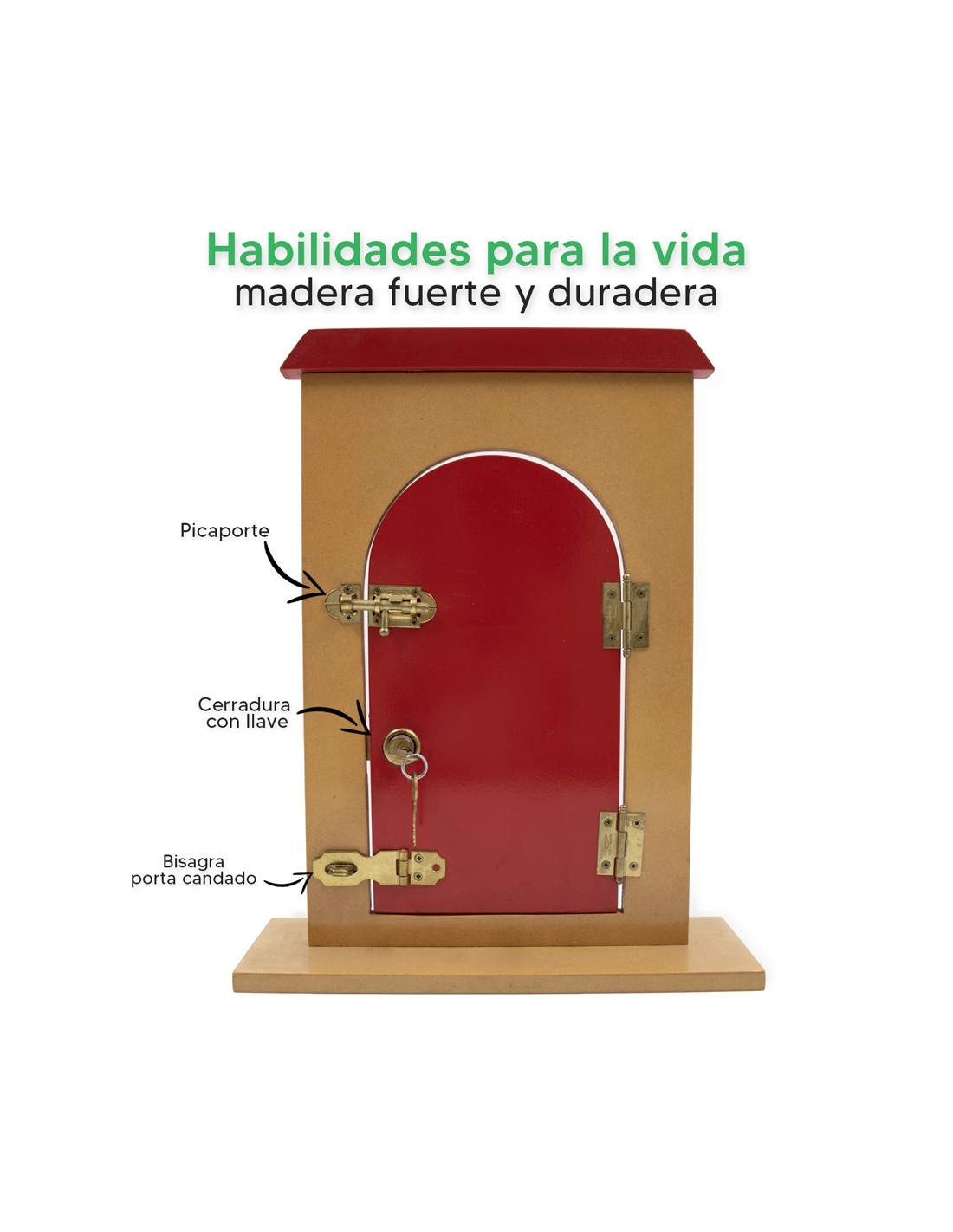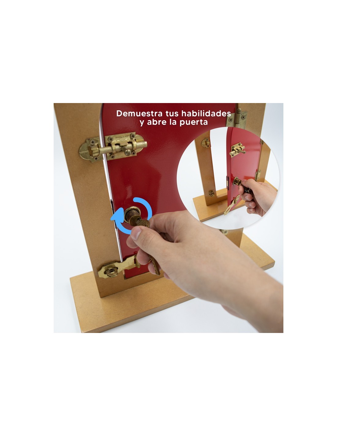 Puerta hecha de madera con diferentes mecanismos de bloqueo y 1 cerradura de puerta con llaves, no tóxico, pintura al agua, sin olor químico. Todas las superficies son lisas, pulidas y tienen bisagras de metal No es FÁCIL DE OXIDAR. Recomendado a partir de 3 años.