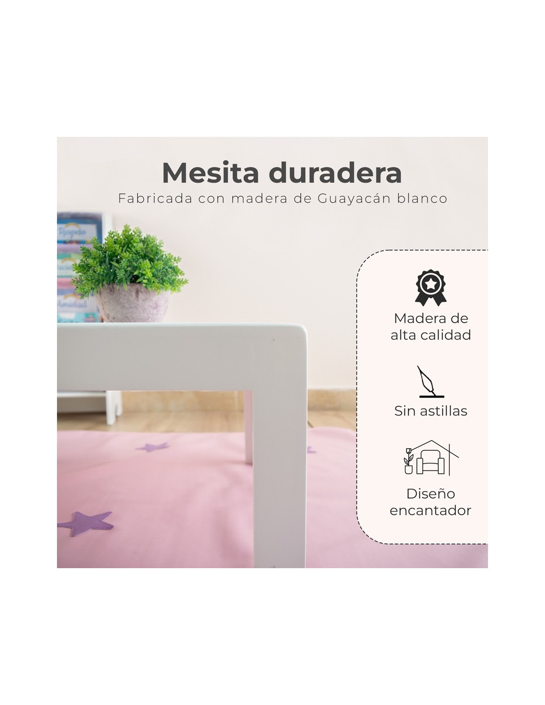 - Una mesita cercana para apoyar juegos, lámparas o incluso más libros.