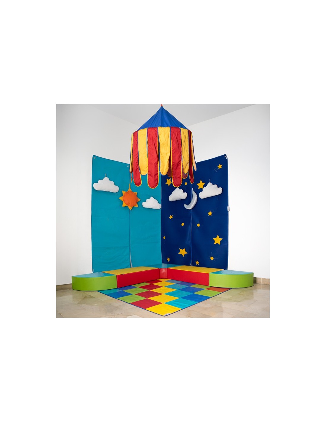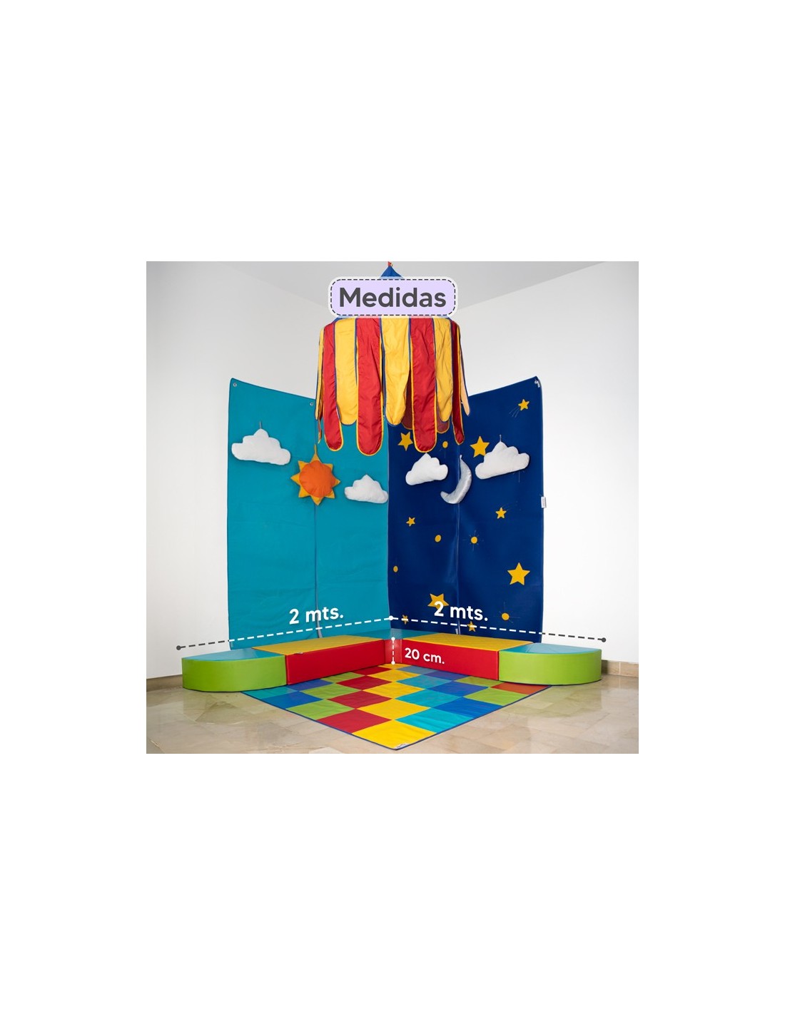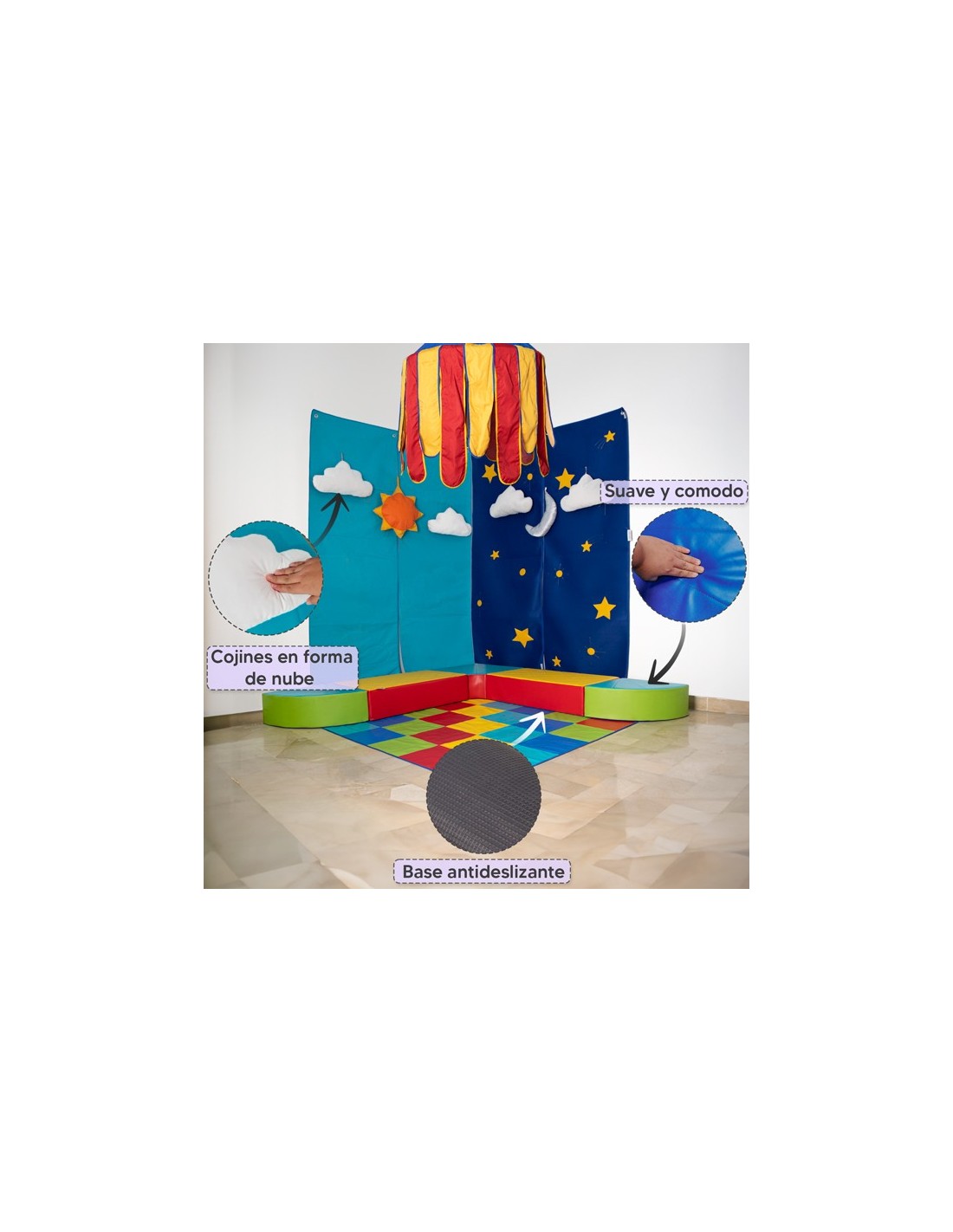 Este kit contiene 17 piezas: 4 cojines en forma de nube +1 cojín de sol + 1 cojín de luna + 1 pérgola + 4 paneles de cielo (2 de día y 2 de noche) + 5 pouffe + 1 tapete (140 x 140)