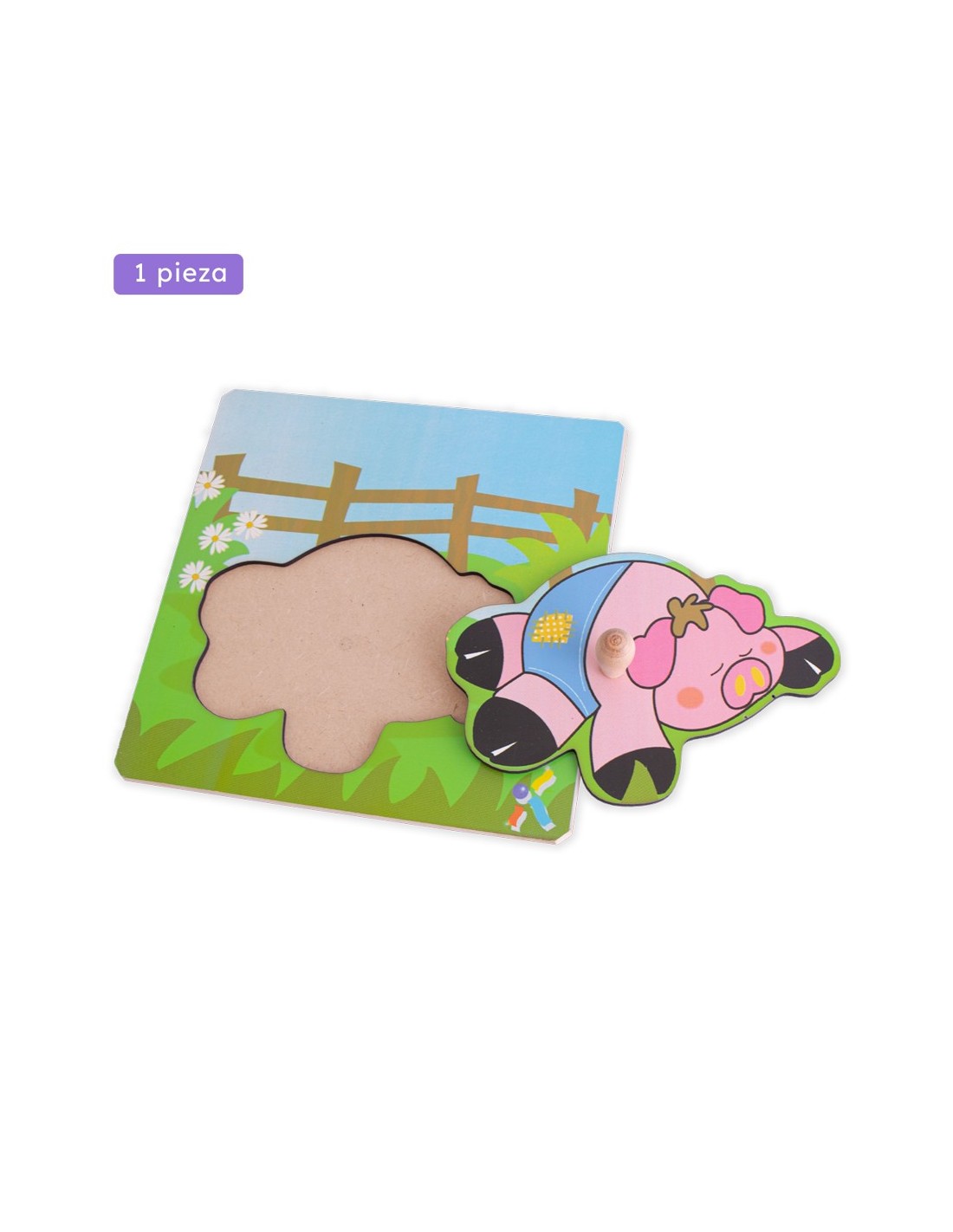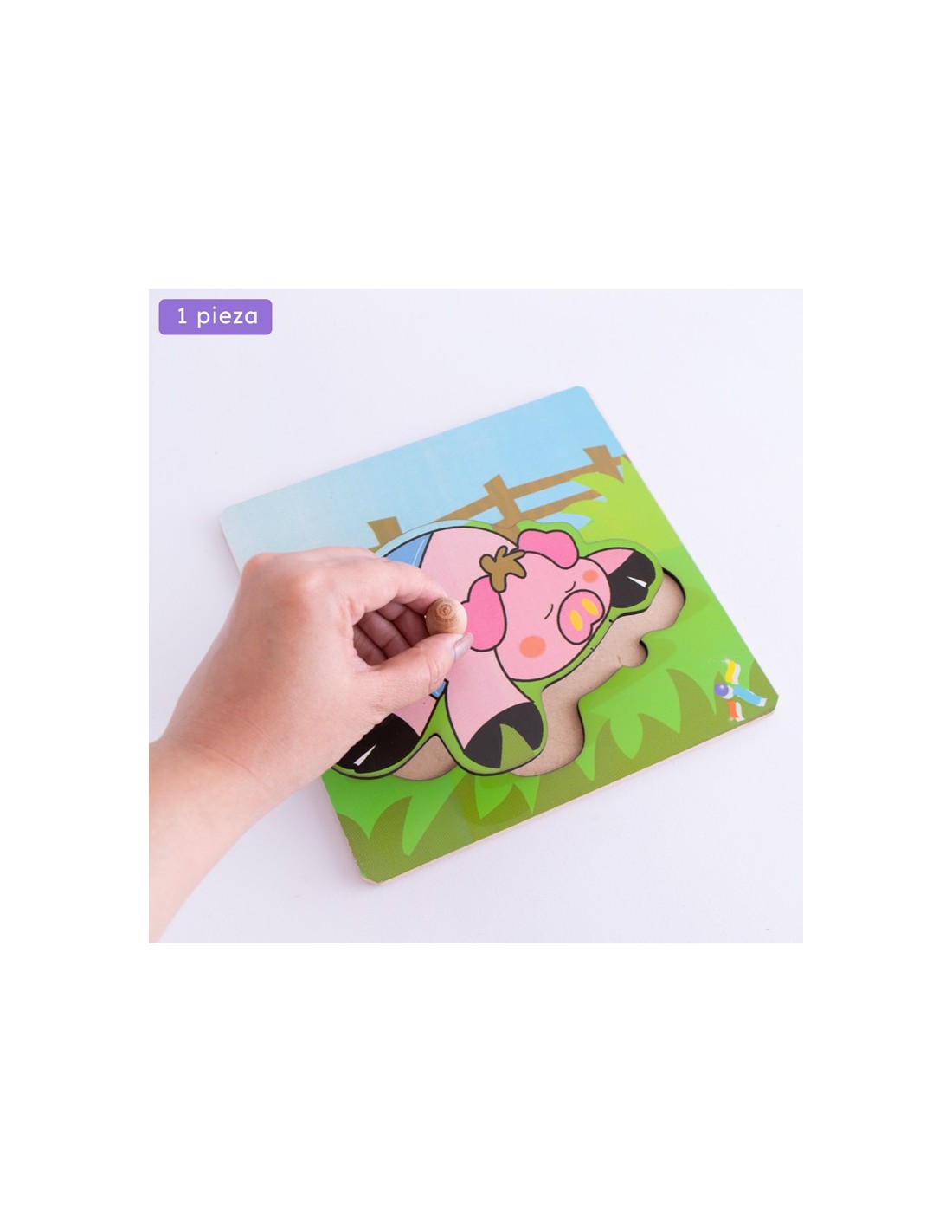 Rompecabezas encajable elaborado en madera con pocas piezas para bebés. Pintura pintada directamente en la madera con protección UV, tintes no tóxicos. Incluye pin de madera que se ubica en los agujeros y le permite agarrar la pieza utilizando los de los dedos (pinzas digitales).