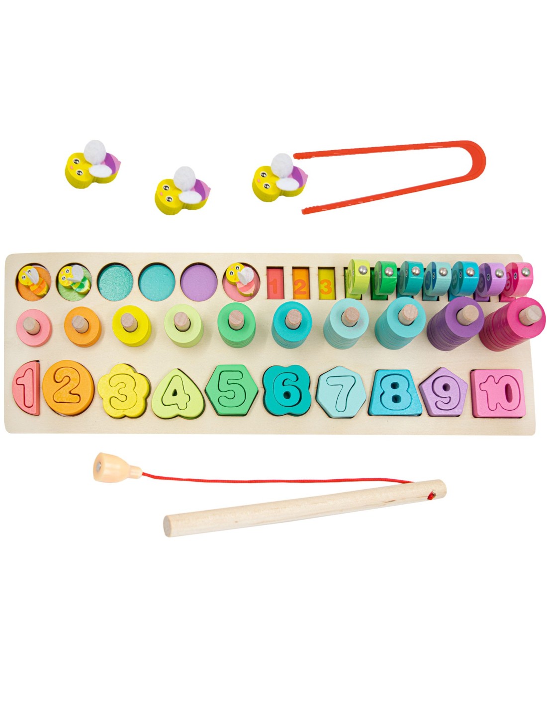 Rompecabezas multifuncional de madera Montessori para niños. Es un juego didáctico cognitivo con los números del 1 al 10 en madera y figuras geométricas. Este tablero contiene múltiples actividades para aprender a reconocer los números, apilar los anillos y pescar las abejitas. Contiene caña de pescar en madera para realizar ejercicio de coordinación ojo-mano.