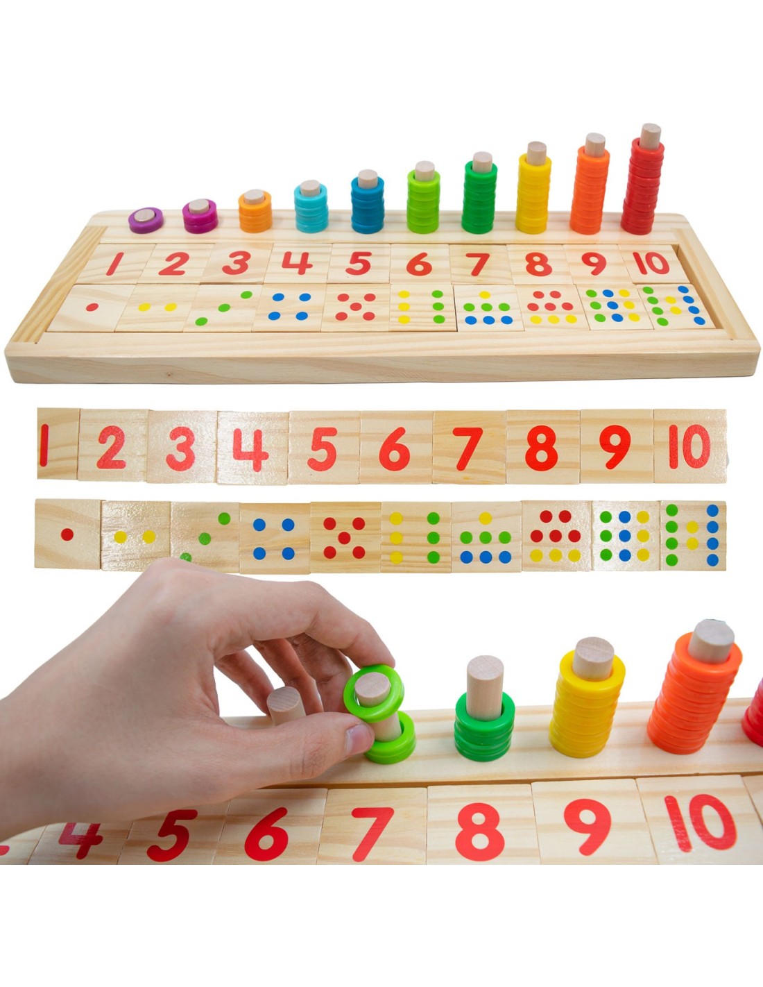 - Juego de actividades múltiples: nuestro tablero Montessori incluye un tablero de madera, 10 bloques de números, anillos de conteo, 10 bloques con cantidades.