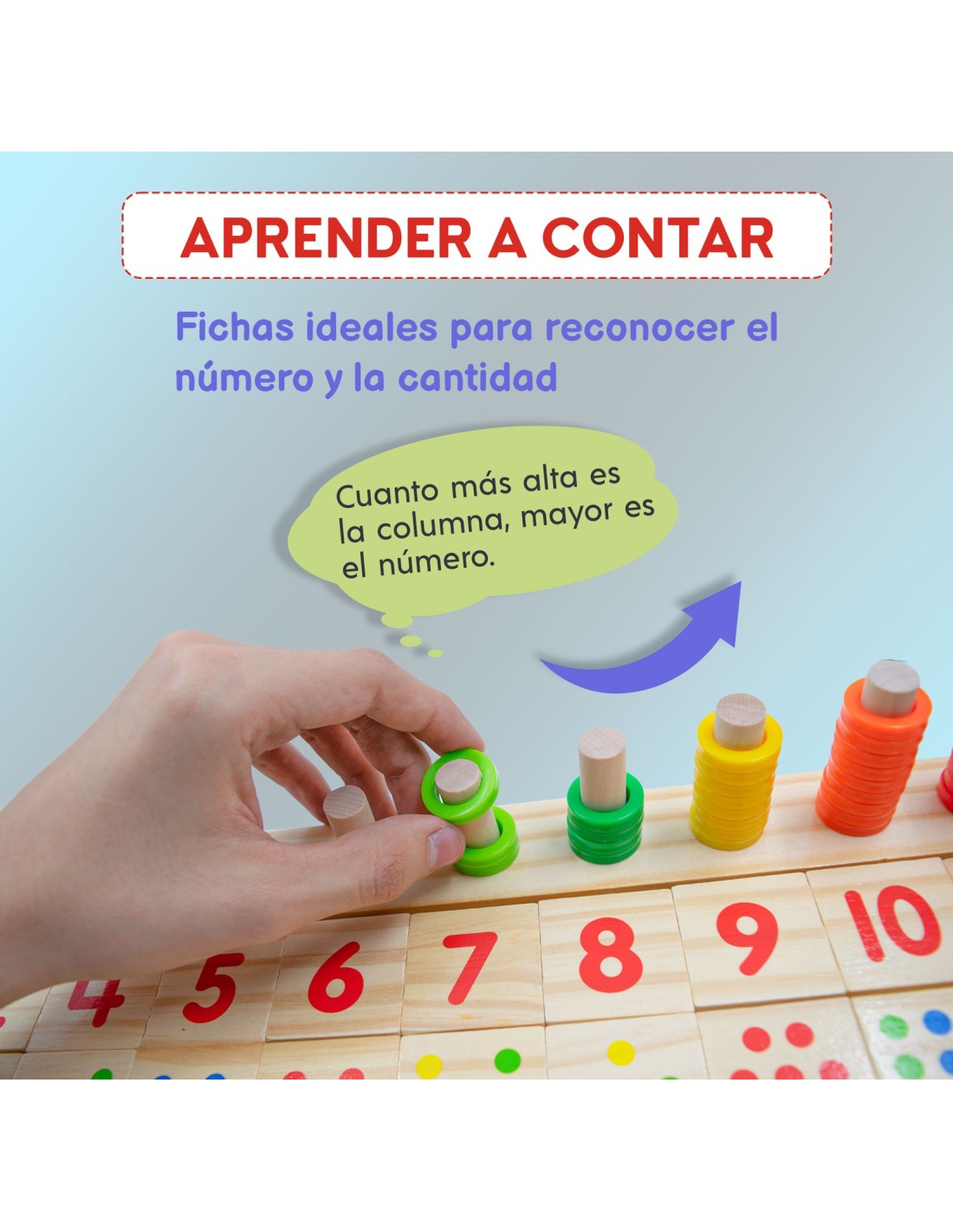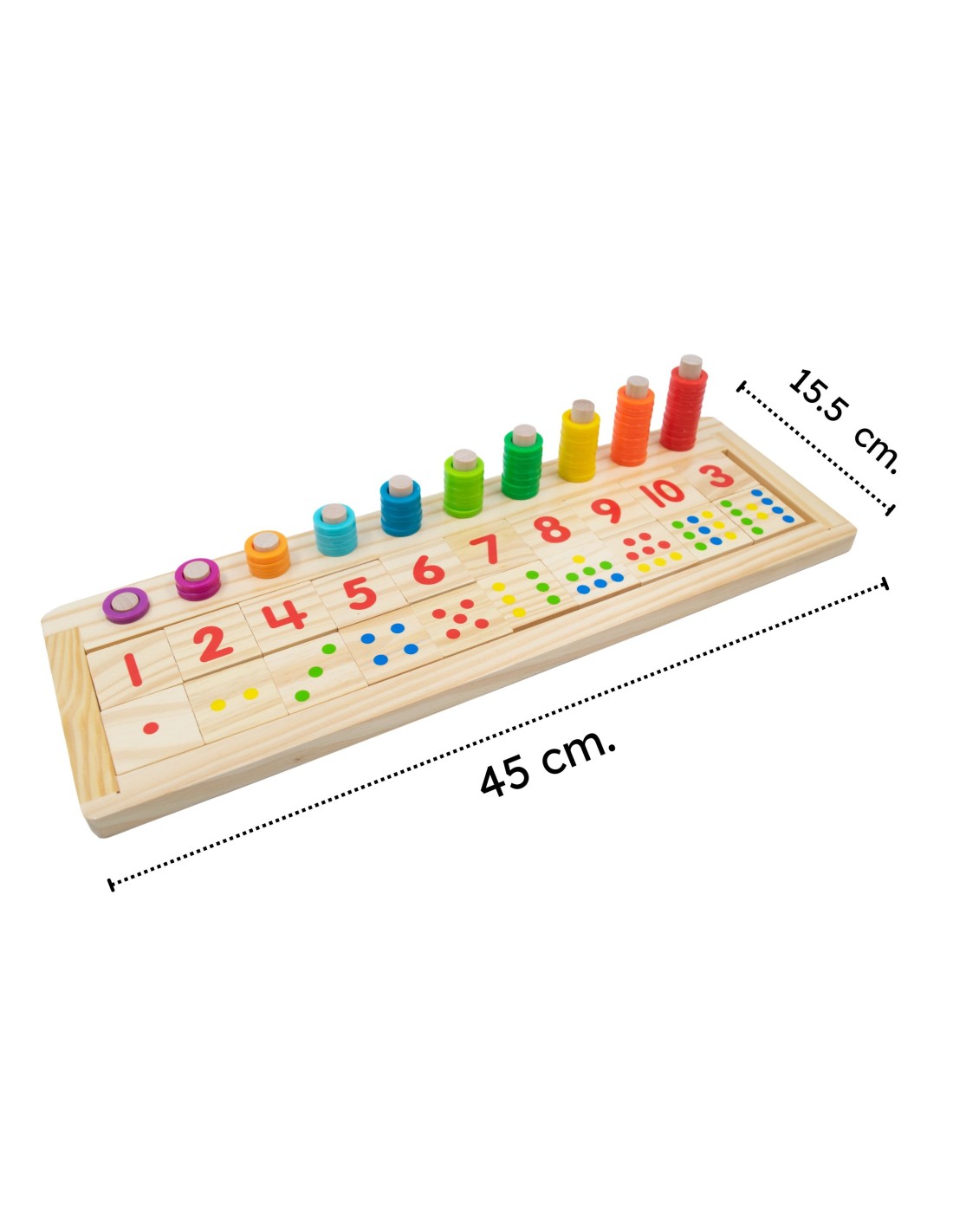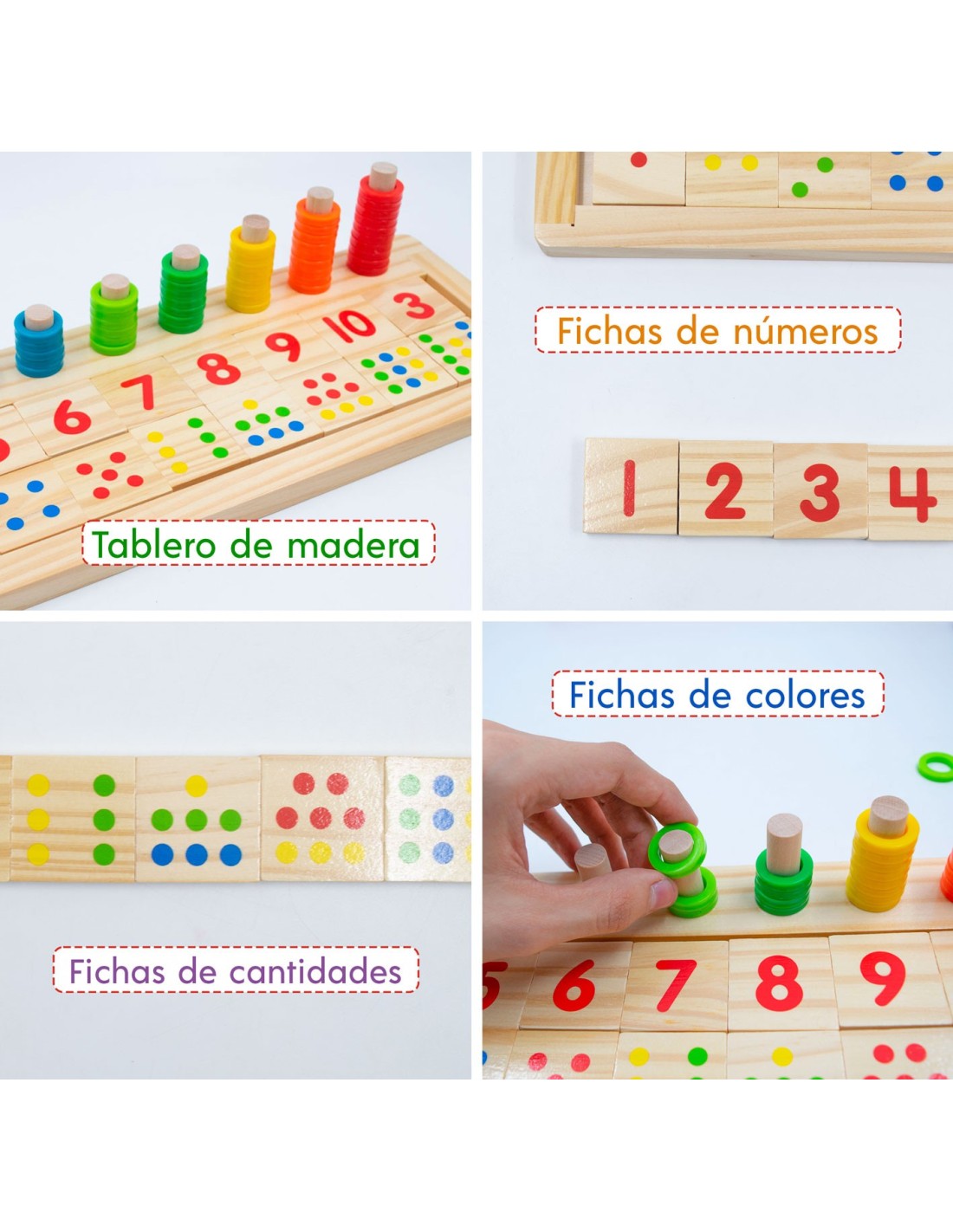 Rompecabezas multifuncional de madera Montessori para niños. Es un juego didáctico cognitivo con números del 1 al 10 en madera con fichas de madera. Este tablero contiene múltiples actividades para aprender a reconocer los números y su respectiva cantidad. Contiene fichas de colores y fichas de números impresos en la madera.