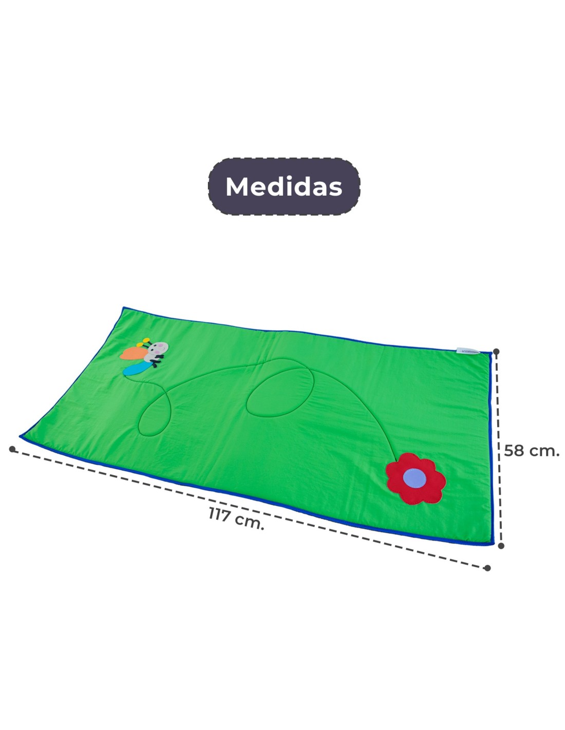 Todos los diseños están cosidos (no estampados). No produce ácaros, puesto que no es una alfombra y lo mejor de todo es supergrande. Medida 117 cm. x 58 cm.