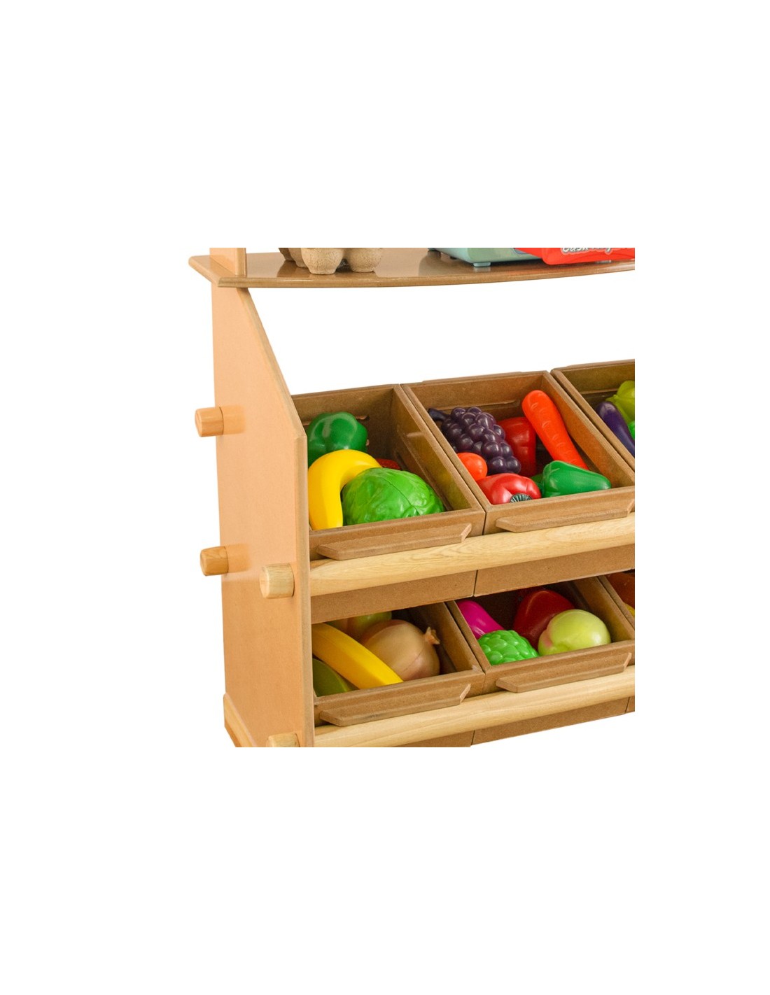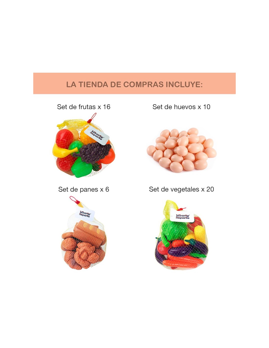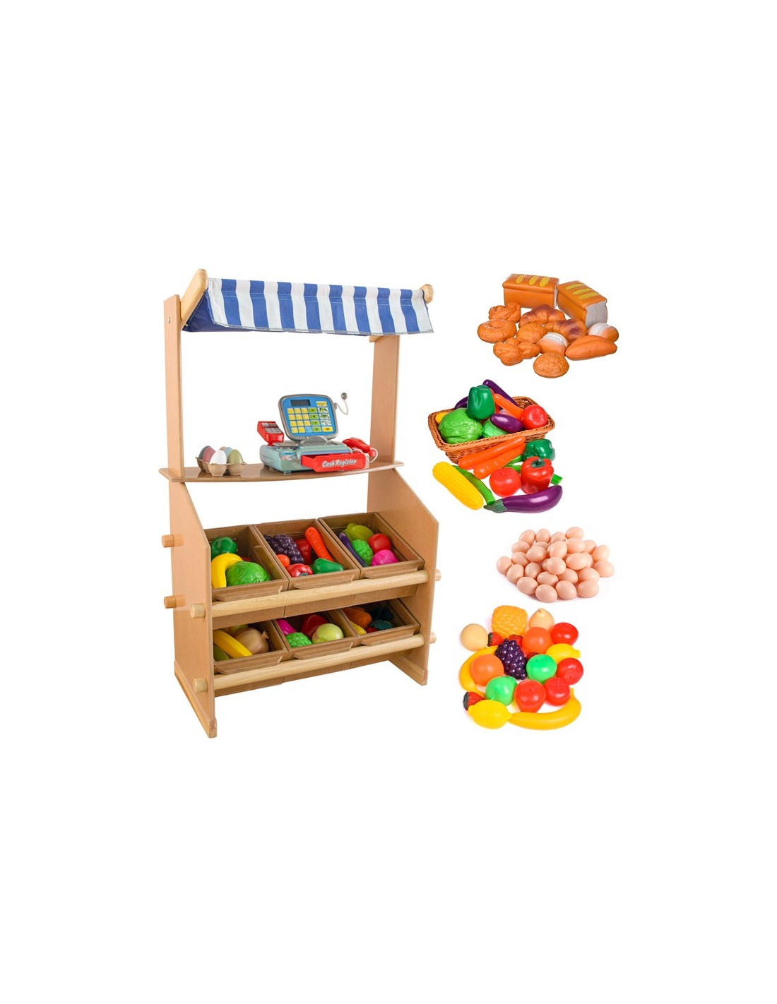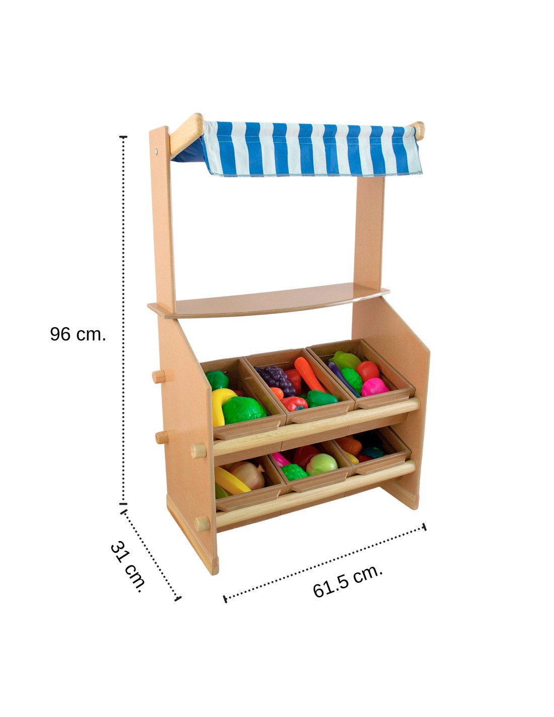 Permite el juego imaginativo: abre un mundo de imaginación con esta vibrante tienda de madera para comestibles. Construido para mayor durabilidad, este juego de compras es un complemento perfecto para cualquier espacio de juego. Incluye frutas, vegetales, huevos y panes de plástico. Además incluyen 6 canastas de madera y 1 tolda reversible de dos colores (colores pueden variar). Requiere montaje.