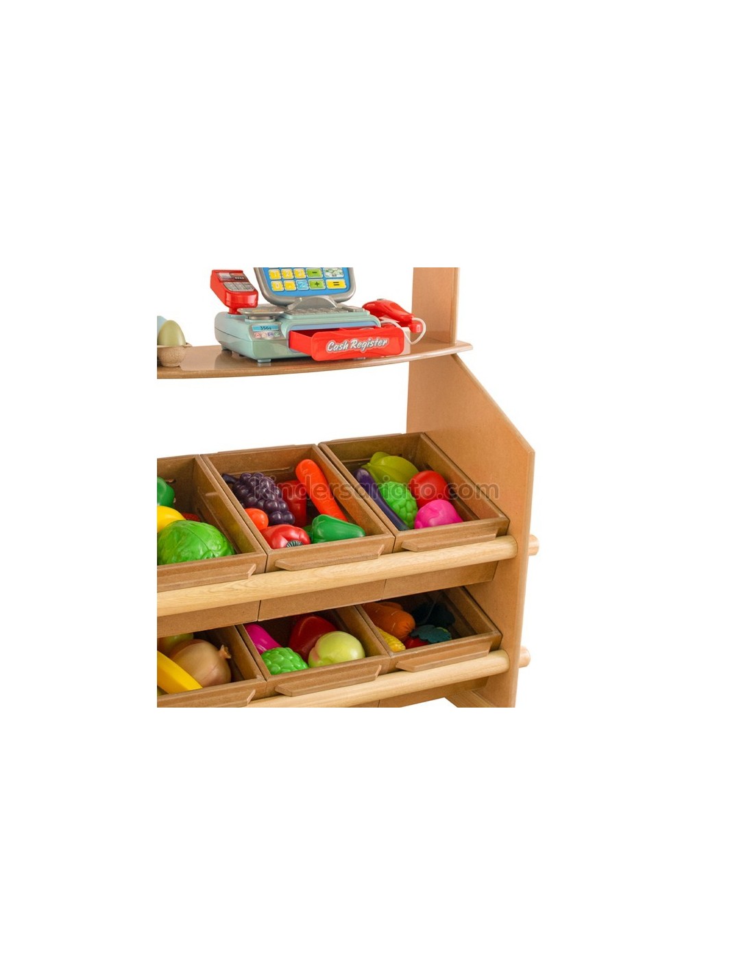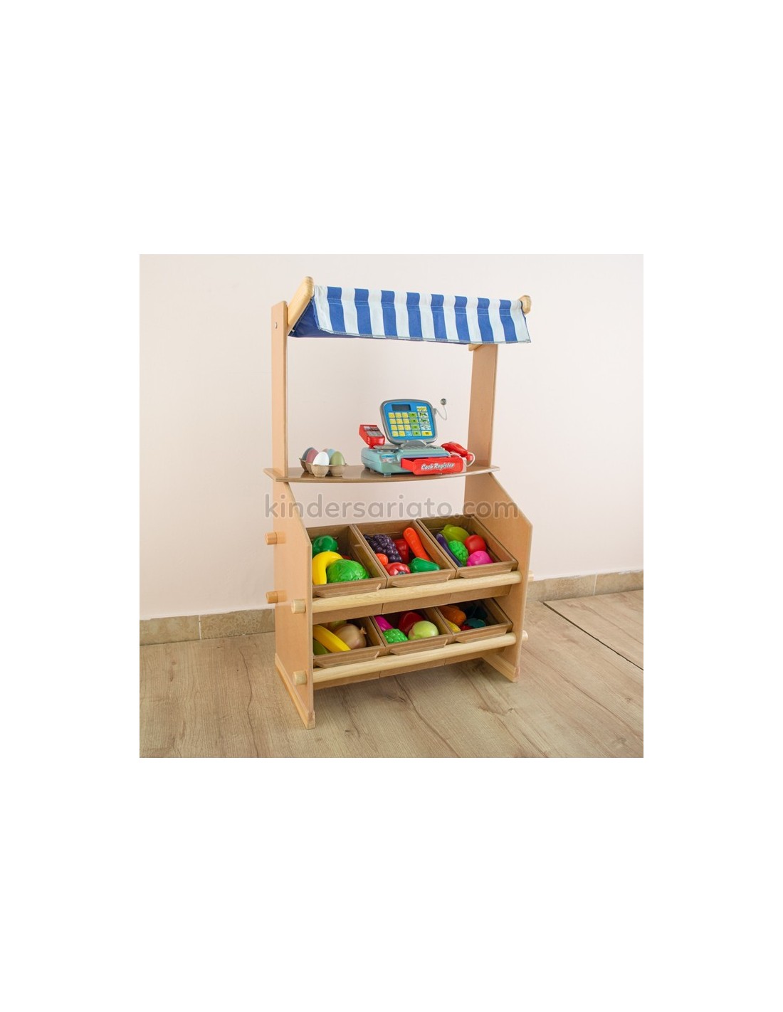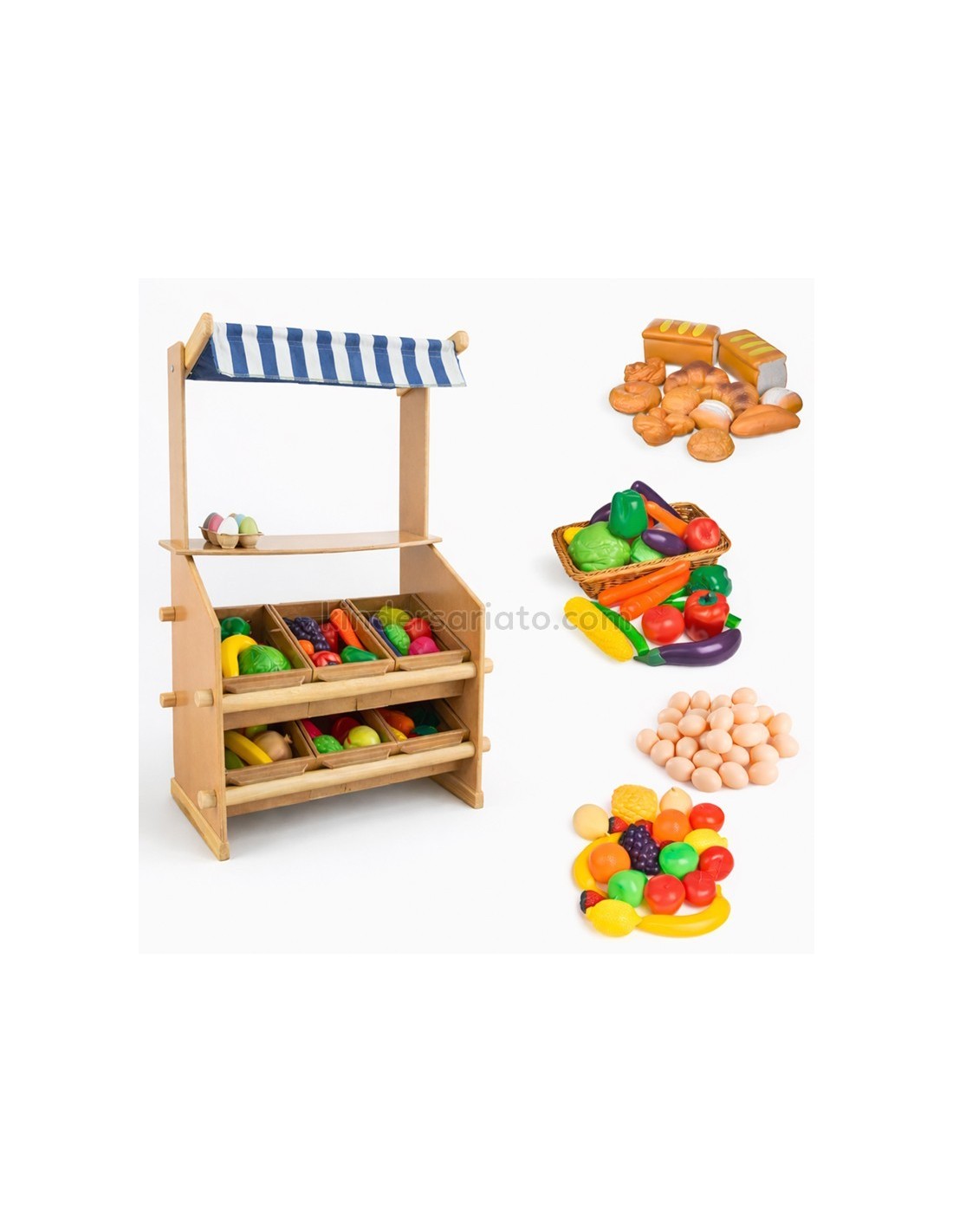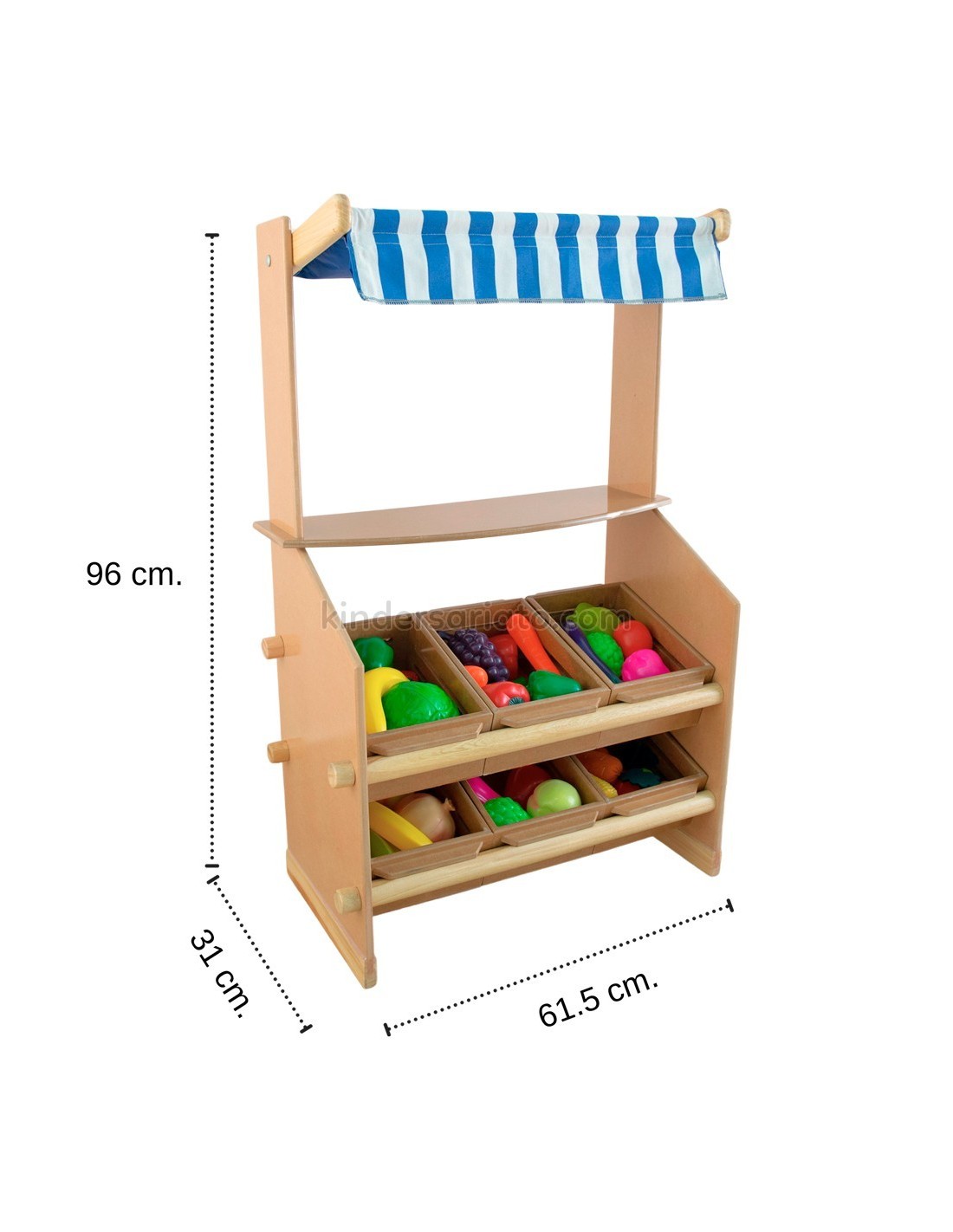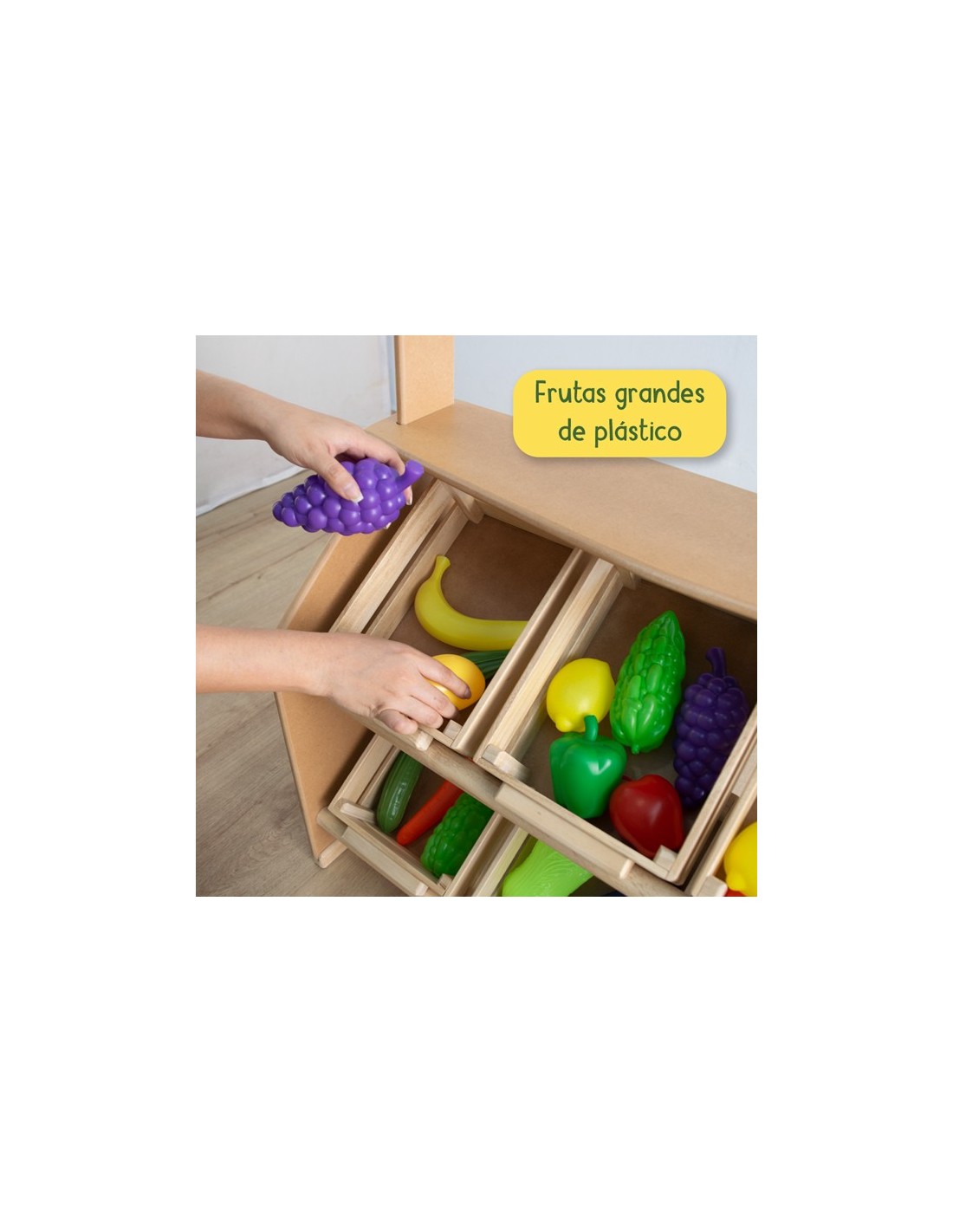Permite el juego imaginativo: abre un mundo de imaginación con esta vibrante tienda de madera para comestibles. Construido para mayor durabilidad, este juego de compras es un complemento perfecto para cualquier espacio de juego. Incluye frutas, vegetales, huevos y panes de plástico. Además incluyen 6 canastas de madera y 1 tolda reversible de dos colores (colores pueden variar). Requiere montaje.
