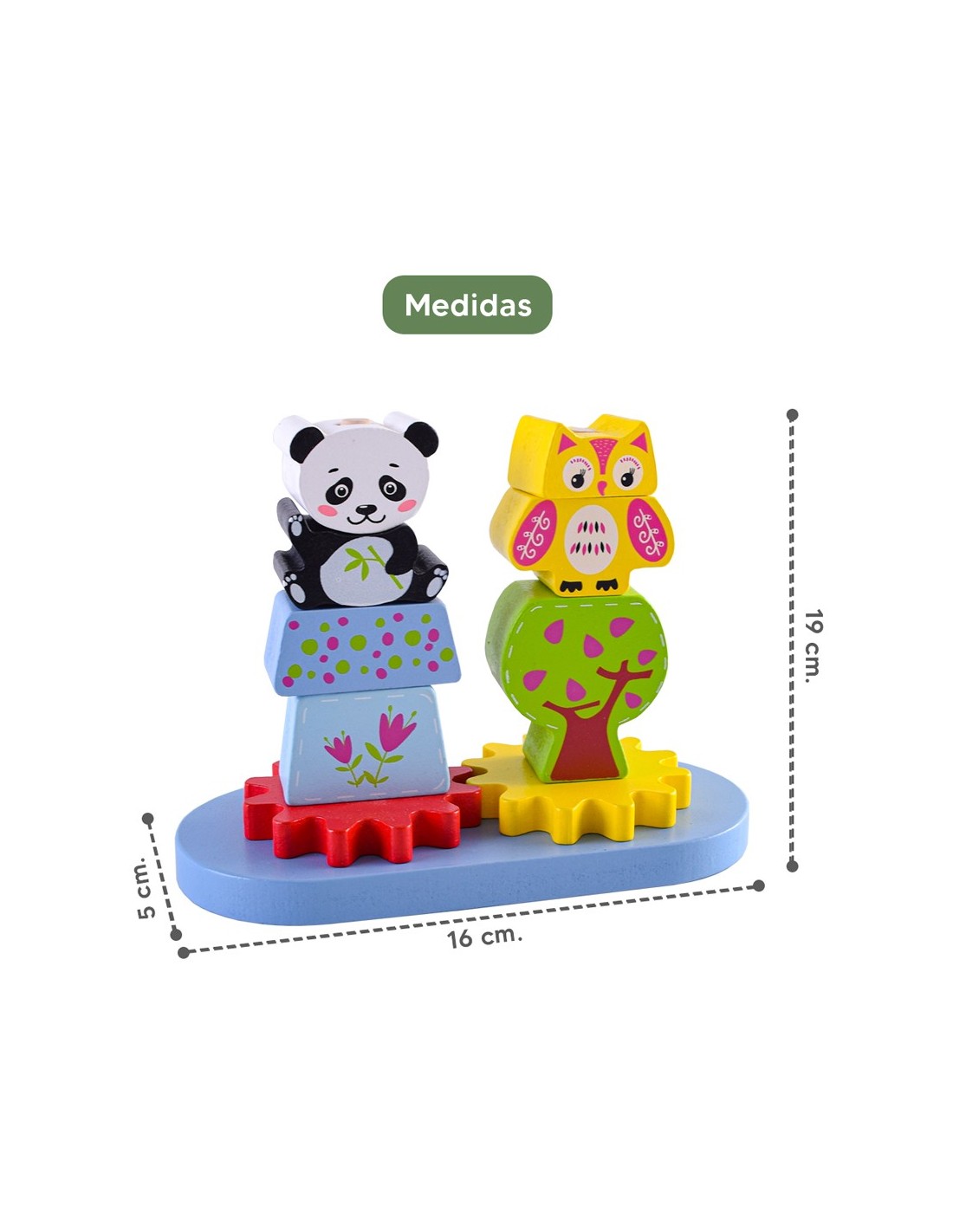 Torres de madera para ensartar formas geométricas, indicado para apilar por tamaño, color y forma geométrica. Ejercita su coordinación ojo-mano y su sistema motor fino. Indicado para bebés de 12 meses en adelante.
